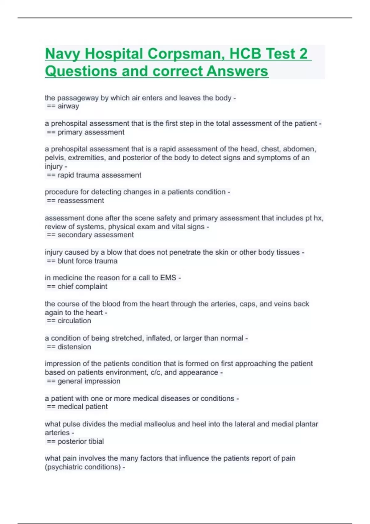 Navy Hospital Corpsman, HCB Test 2 Questions and correct Answers.