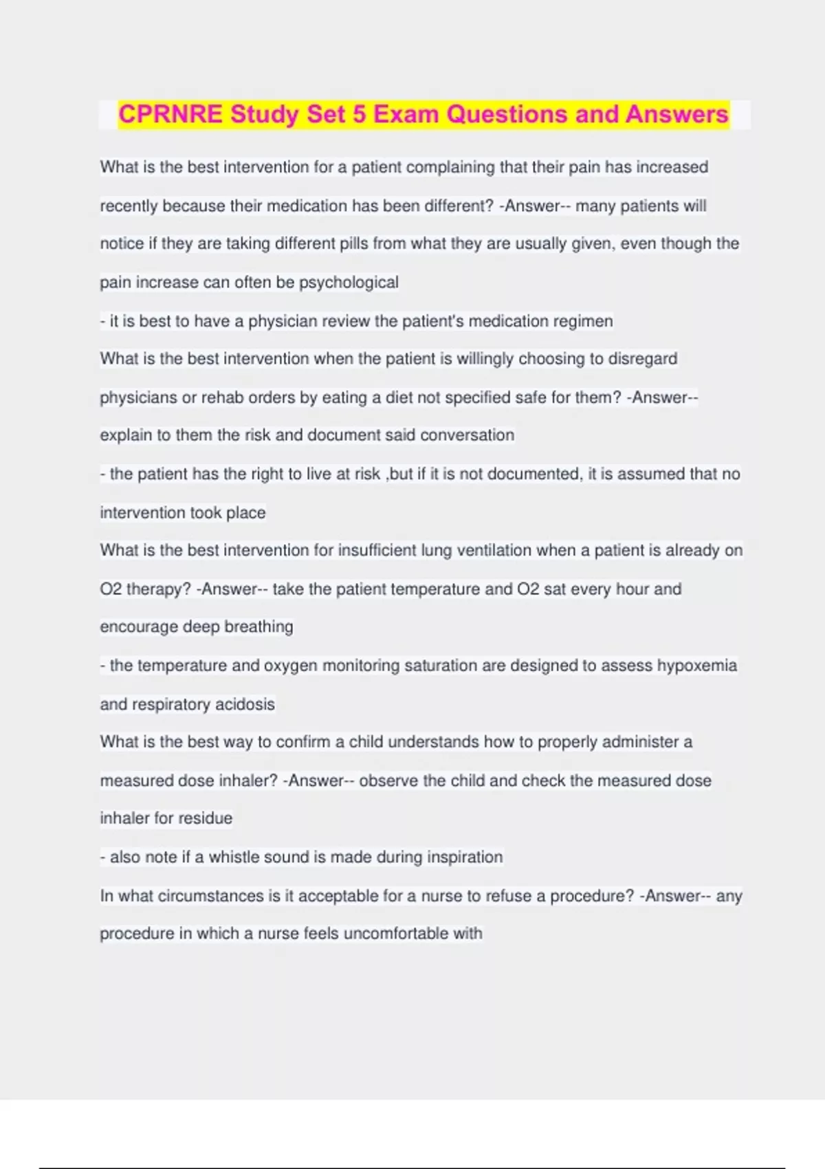 CPRNRE Study Set 5 Exam Questions and Answers What is the best intervention for a patient complaining that their pain has increased recently because their medication has been different? -Answer-- many patients will notice if they are taking different pills from what they are usually given, even though the pain increase can often be psychological - it is best to have a physician review the patient's medication regimen What is the best intervention when the patient is willingly choosing to disregard physicians or rehab orders by eating a diet not specified safe for them? -Answer-- explain to them the risk and document said conversation - the patient has the right to live at risk ,but if it is not documented, it is assumed that no intervention took place What is the best intervention for insufficient lung ventilation when a patient is already on O2 therapy? -Answer-- take the patient temperature and O2 sat every hour and encourage deep breathing - the temperature and oxygen monitoring saturation are designed to assess hypoxemia and respiratory acidosis What is the best way to confirm a child understands how to properly administer a measured dose inhaler? -Answer-- observe the child and check the measured dose inhaler for residue - also note if a whistle sound is made during inspiration In what circumstances is it acceptable for a nurse to refuse a procedure? -Answer-- any procedure in which a nurse feels uncomfortable with - or any procedure which is out of a nurse's scope of competency/practice can be refused What is the best way to prevent air from getting in a new intravenous bag change tubing? -Answer-- keep the bag upright before closing the roller clamp What is the best intervention for a violent patient? -Answer-- call for assistance - in most cases, a code will be called and the patient will be either physically or chemically sedated - often both will be used What are the most common signs that a patient's fluid balance has been restored? - Answer-- decreased blood urea nitrogen, serum sodium, and urine output of over 25cc an hour What is an important key to remember when assessing pediatric patient of different cultures? -Answer-- not all pediatric patients will fall into the specified average height/weight ratio - this does not necessarily mean a problem will occur later in life What is the most important vital sign which shows a patient's mental status is decreasing? -Answer-- respiration rate of less than 10 per minute - this indicates sign of CNS depression What is the leading cause of gastric ulcer? -Answer-- the bacterium Helico Pylori - this bacterium is present in 50-75% of patient with gastric ulcers and interferes with the resistance of gastric mucosa