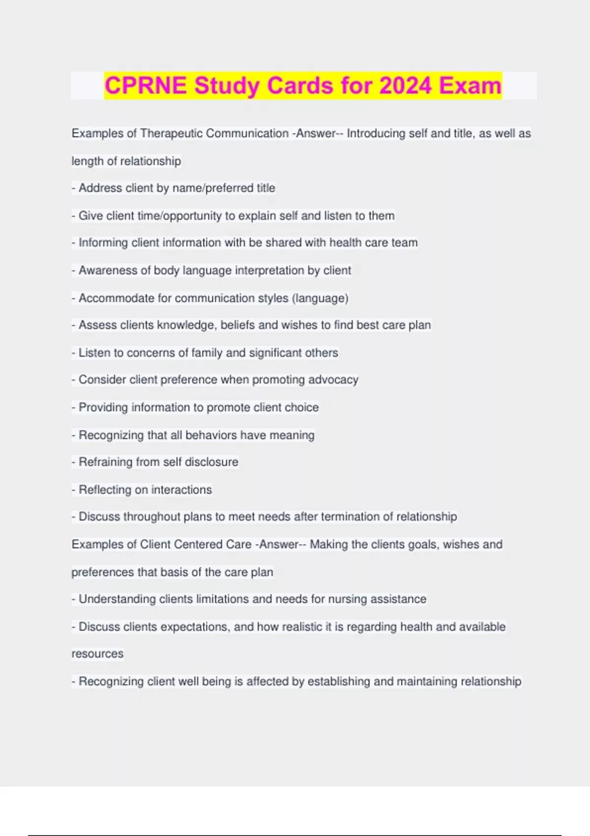 CPRNE Study Cards for 2024 Exam Examples of Therapeutic Communication -Answer-- Introducing self and title, as well as length of relationship - Address client by name/preferred title - Give client time/opportunity to explain self and listen to them - Informing client information with be shared with health care team - Awareness of body language interpretation by client - Accommodate for communication styles (language) - Assess clients knowledge, beliefs and wishes to find best care plan - Listen to concerns of family and significant others - Consider client preference when promoting advocacy - Providing information to promote client choice - Recognizing that all behaviors have meaning - Refraining from self disclosure - Reflecting on interactions - Discuss throughout plans to meet needs after termination of relationship Examples of Client Centered Care -Answer-- Making the clients goals, wishes and preferences that basis of the care plan - Understanding clients limitations and needs for nursing assistance - Discuss clients expectations, and how realistic it is regarding health and available resources - Recognizing client well being is affected by establishing and maintaining relationship - Recognize biases and feelings established through life that could affect relationship - Acknowledging and managing stress - Engaging client in evaluating the nursing care - Committing to availability - Requesting therapeutic transfer of care if relationship does not evolve Examples of Maintaining Boundaries -Answer-- Helping clients understand when requests are beyond limits of boundaries - Following care plan aiming to clients needs - Make sure any action that could be seen as crossing boundaries is in care plan (having coffee with mental health client may be appropriate) - Nurse does not interfere with personal relationships - Abstaining from disclosing personal information - Continually clarifying his/her role in situation - Coexisting relationships do not interfere - Consult with health care team when it is unclear if boundaries have been crossed - Goals are made to meet the needs of the client and not the nurse - Consider cultural value of the context of maintaining boundaries When do you accept a gift? -Answer-When refusal will harm the nurse-client therapeutic relationship - Consider that the gift was not solicited by the nurse, the client is mentally competent, and the clients intent of offering the gift When can you give a gift? -Answer-- The client knows the nurses want nothing in return - Does not change the dynamic of the relationship - No potential for negative feelings Examples of Protecting Client from Abuse -Answer-- Always intervene and report - Intervene when the client feels abused - Intervening and reporting health care team members abusing clients - Not entering friendship, romantic, sexual or personal relationship with the client - Not engaging in behaviors that may be perceived as violent/abusive - Not neglecting basic needs - Not accepting POA positions and other positions of power over the client When can you enter a personal relationship with a client after termination of nurse-client relationship? -Answer-- When determined that relationship with not have negative impact on future care for client - Client is clear that relationship is no longer therapeutic - The relationship is not based off of therapeutic relationship previously established Warning Signs of Boundary Crossing -Answer-- Spending extra time - Changing client assignments to care for clien