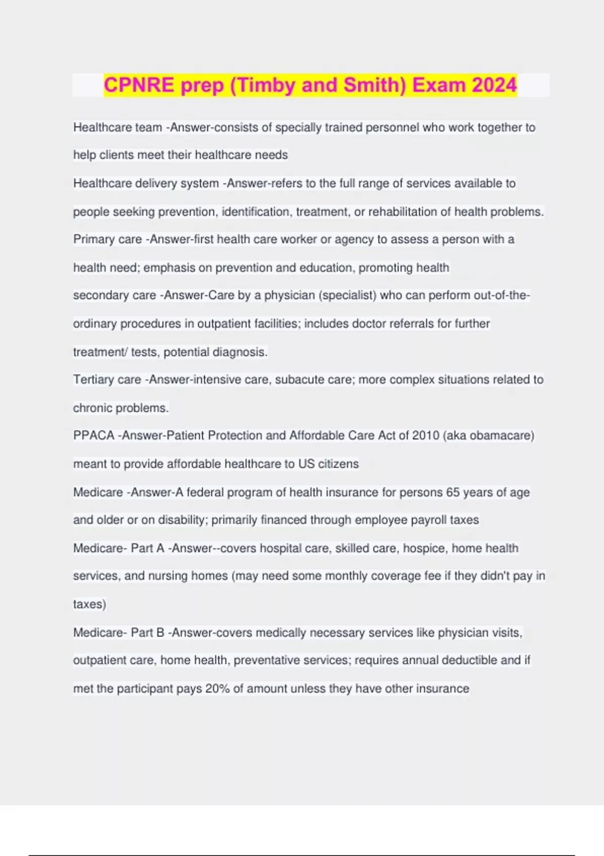 CPNRE prep (Timby and Smith) Exam 2024 Healthcare team -Answer-consists of specially trained personnel who work together to help clients meet their healthcare needs Healthcare delivery system -Answer-refers to the full range of services available to people seeking prevention, identification, treatment, or rehabilitation of health problems. Primary care -Answer-first health care worker or agency to assess a person with a health need; emphasis on prevention and education, promoting health secondary care -Answer-Care by a physician (specialist) who can perform out-of-the- ordinary procedures in outpatient facilities; includes doctor referrals for further treatment/ tests, potential diagnosis. Tertiary care -Answer-intensive care, subacute care; more complex situations related to chronic problems. PPACA -Answer-Patient Protection and Affordable Care Act of 2010 (aka obamacare) meant to provide affordable healthcare to US citizens Medicare -Answer-A federal program of health insurance for persons 65 years of age and older or on disability; primarily financed through employee payroll taxes Medicare- Part A -Answer--covers hospital care, skilled care, hospice, home health services, and nursing homes (may need some monthly coverage fee if they didn't pay in taxes) Medicare- Part B -Answer-covers medically necessary services like physician visits, outpatient care, home health, preventative services; requires annual deductible and if met the participant pays 20% of amount unless they have other insurance Medicare Part C (Medicare Advantage Plans) -Answer-Health coverage option includes part A & part b & operated by private insurance companies that are approved by & under contract w medicare Medicare—Part D Prescription Drug Coverage -Answer-helps cover and possibly reduce prescription drug costs Medigap insurance -Answer-insurance provided by private insurance companies to cover medical expenses that are not covered by Medicare Medicaid -Answer-A federal and state assistance program that pays for health care services for people who cannot afford them. Including: -inpatient/ outpatient hospital services -screening, diagnostic, and treatment services -home health services -physician services -rural health clinics -federally qualified health centre services -lab/ x- ray -family planning services -nurse/ midwifery -pediatric/ family NP services -birth centers -transportation to medical care -tobacco cessation counselling for pregnant women PPS -Answer-Prospective Payment System -a method of reimbursing hcps for their services based on a predetermined fixed rate DRGs -Answer-Diagnostic related groups that pay providers of care for medicare patients a set amount regardless of actual cost, paying a group with similar diagnoses Managed Care Organization (MCO) -Answer-A type of medical plan that pays for and manages the medical care a patient receives. Referred to as capitation which refers to the actual head or person count. Preferred Provider Organization (PPO) -Answer-operates on the principle that competition can control costs; acts as agents for health insurance companies Point of Service (POS) -Answer-insurance plan in which a patient may choose an HMO or a non-HMO provider but must pay a deductible for using a non-HMO provider Physician hospital organizations (PHOs) -Answer-Consist of hospital and physician practices that merge into vertically integrated structures. They negotiate fees for services for their self-insured employees through MCO. UAPs -Answer-Unlicensed Assistive Personnel; help nurses provide direct care to patients. As defined by individual state boards of nursing, UAPs may have the title of certified nursing assistants (Cna), orderlies, attendants, or technicians. 1. A client with chronic illness always reports feeli