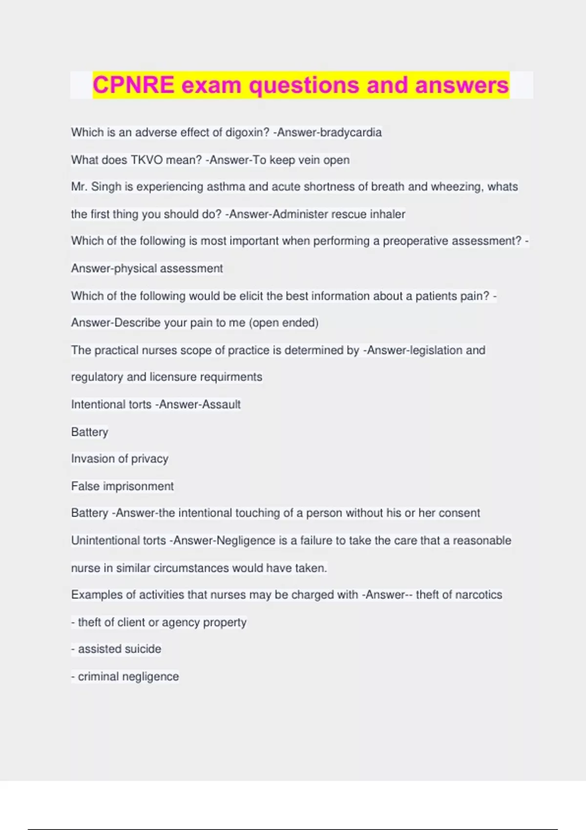 CPNRE exam questions and answers Which is an adverse effect of digoxin? -Answer-bradycardia What does TKVO mean? -Answer-To keep vein open Mr. Singh is experiencing asthma and acute shortness of breath and wheezing, whats the first thing you should do? -Answer-Administer rescue inhaler Which of the following is most important when performing a preoperative assessment? - Answer-physical assessment Which of the following would be elicit the best information about a patients pain? - Answer-Describe your pain to me (open ended) The practical nurses scope of practice is determined by -Answer-legislation and regulatory and licensure requirments Intentional torts -Answer-Assault Battery Invasion of privacy False imprisonment Battery -Answer-the intentional touching of a person without his or her consent Unintentional torts -Answer-Negligence is a failure to take the care that a reasonable nurse in similar circumstances would have taken. Examples of activities that nurses may be charged with -Answer-- theft of narcotics - theft of client or agency property - assisted suicide - criminal negligence Common negligence acts -Answer-medication errors, intravenous therapy errors that result in phlebitis or infiltrations, burns caused by equipment, falls, failure to use aseptic technique, failure to report, failure to monitor a patients condition, failure to notify a physician Principles of accountability for nurses -Answer-- responsible and accountable for their decisions and actions - engage in self reflection and continuous learning to maintain and enhance competence - accountable and responsible for assessing their individual fitness to practice. - practical nurses demonstrate and apply knowledge of the distinction between ethical responsible and legal rights Code of nursing ethics -Answer-- being accountable for ones actions - upholding the patients rights to privacy and confidentiality - providing care that maintains pt dignity - respect at all times - promoting integrity by providing safe, competent, and ethical nursing care - evaluating ones work and maintaining competency A professional relationship is created through -Answer-the nurses application of knowledge, communication theory, understanding of human behaviour, and commitment to ethical behaviour. Four phases of the nurse client relationship -Answer-*Pre-interaction*: Gathering information; assessing one's feelings, fears, and anxieties about working with a particular client *Orientation*: nurse and client become acquainted. Goal is to establish trust. *Working*: Goal is to promote client change *Termination*: Evaluate goal attainment; and ensure therapeutic closure -penia -Answer-reduced amount Best approach to conflict resolution -Answer-collaboration The repeat back method consists of -Answer-identification, situation, background, assessment, recommendations, repeat back before consent, patients need to receive -Answer-full disclosure of all details of the procedure. Can practical nurses obtain consent for surgery? -Answer-no because they are not conducting the surgery, but may be a witness consent can be -Answer-verbal, written, and implicit Example of implicit consent; -Answer-client lifting leg for wound care Cno practice standard for resuscitation is based on these ethical values -Answer-- respect for ones well-being - client choice - privacy and confidentiality - respect for life - maintaining comittments - truthfulness and fairness medication treatment is used for -Answer-dx, treatment, cure, relief, and prevention Idiosyncratic reactions -Answer-are unpredictable and occur when an individual overreaction from the medication or has a different reaction from the norm. After a medication is taken it breaks down in the body and is -Answer-absorbed, distributed, metabolized, and excreted 10 rights of medication administration -Answer-right medication, right dose, right client, right route, right time, right documentation, right reason, right to refuse, right client education, right evaluation oral medications -Answer-given by mouth. easiest route , most common, and has the slowest, most prolonged effect sublingual medications -Answer-placed under the tongue and should not be swallowed. parenteral medications -Answer-injected into the body tissues. The four main sites are: - intradermal, subcutaneous (only for volumes of 0.5-1ml) - intramuscular (for volumes up to 3ml) - IV inhalation route -Answer-used to administer medications through nasal passages, orally, by endotracheal tube or via tracheostomy The nursing process -Answer-1. assessment 2. analysis 3. planning 4. implementation 5. evaluation, outcome, and revision of care During a documentation session in the hospital, one of the new practical nurses asks what abbreviations can be used within the patients health record? what abbreviations can the nurse use? -Answer-Must be approved by the agency (hospital)