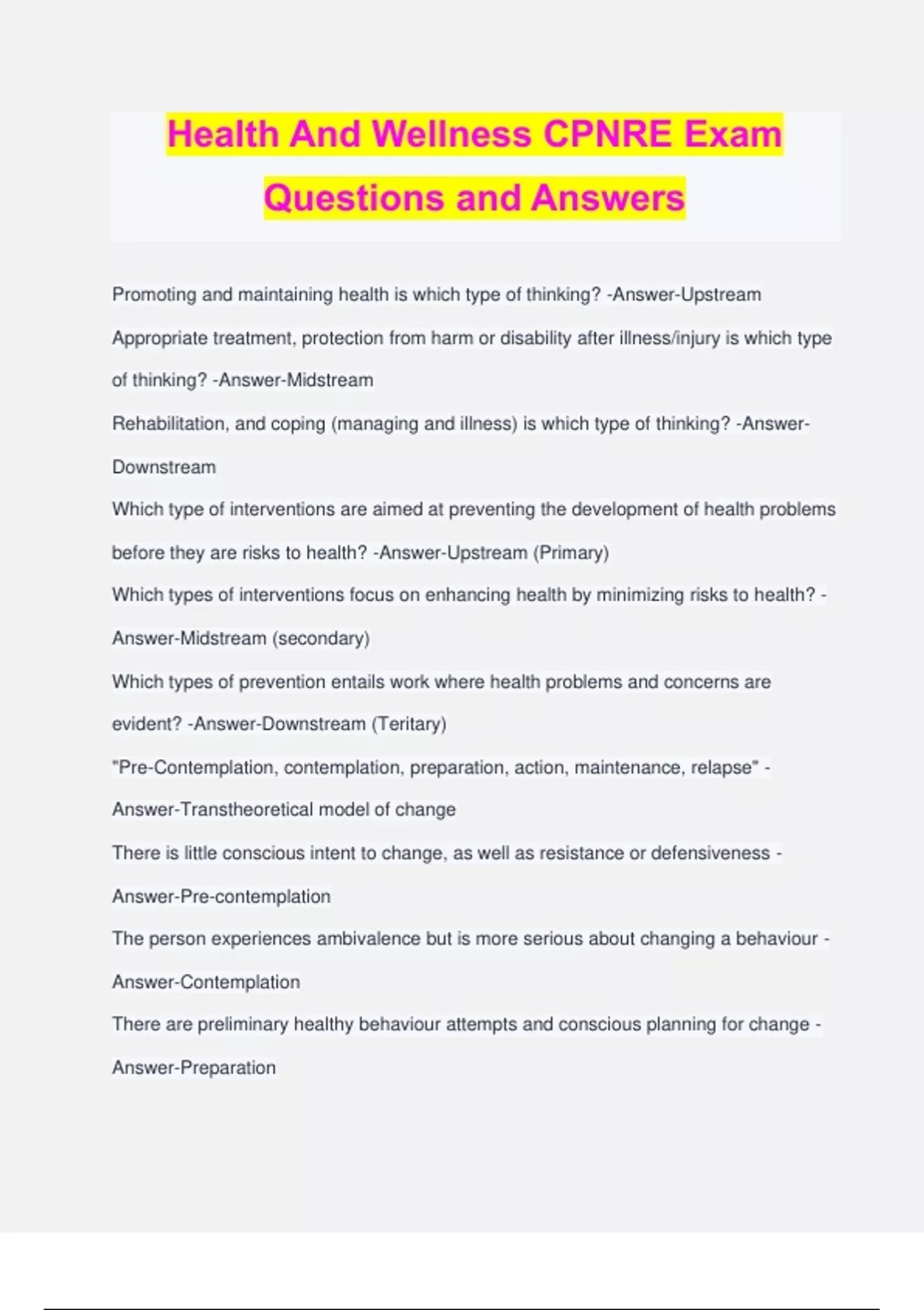 Health And Wellness CPNRE Exam Questions and Answers Promoting and maintaining health is which type of thinking? -Answer-Upstream Appropriate treatment, protection from harm or disability after illness/injury is which type of thinking? -Answer-Midstream Rehabilitation, and coping (managing and illness) is which type of thinking? -Answer- Downstream Which type of interventions are aimed at preventing the development of health problems before they are risks to health? -Answer-Upstream (Primary) Which types of interventions focus on enhancing health by minimizing risks to health? - Answer-Midstream (secondary) Which types of prevention entails work where health problems and concerns are evident? -Answer-Downstream (Teritary) "Pre-Contemplation, contemplation, preparation, action, maintenance, relapse" - Answer-Transtheoretical model of change There is little conscious intent to change, as well as resistance or defensiveness - Answer-Pre-contemplation The person experiences ambivalence but is more serious about changing a behaviour - Answer-Contemplation There are preliminary healthy behaviour attempts and conscious planning for change - Answer-Preparation