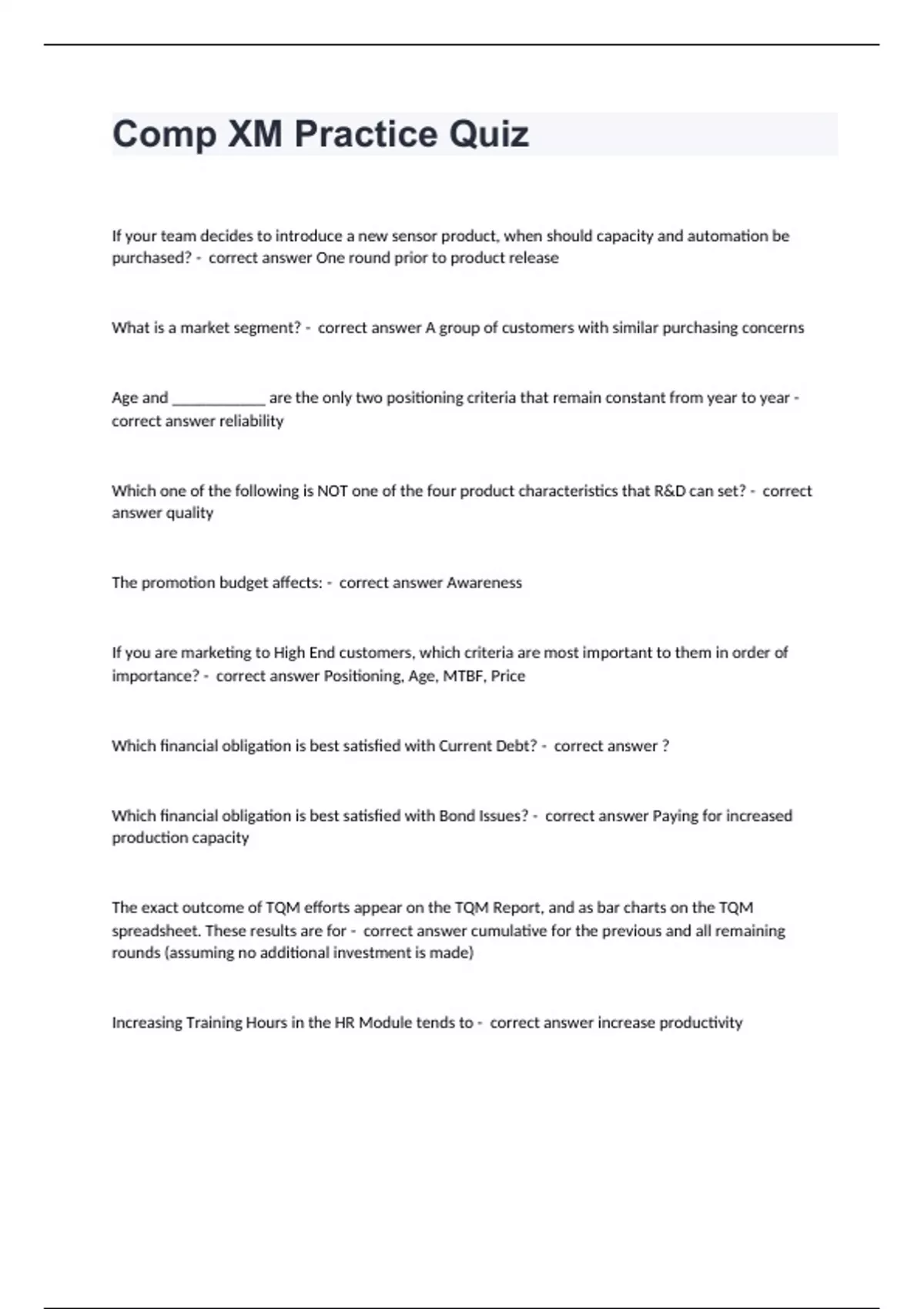 Comp XM Practice QuizIf your team decides to introduce a new sensor product, when should capacity and automation be purchased? - correct answer One round prior to product release What is a market segment? - correct answer A group of customers with similar purchasing concerns Age and ___________ are the only two positioning criteria that remain constant from year to year - correct answer reliability Which one of the following is NOT one of the four product characteristics that R&D can set? - correct answer quality The promotion budget affects: - correct answer Awareness If you are marketing to High End customers, which criteria are most important to them in order of importance? - correct answer Positioning, Age, MTBF, Price Which financial obligation is best satisfied with Current Debt? - correct answer ? Which financial obligation is best satisfied with Bond Issues? - correct answer Paying for increased production capacity The exact outcome of TQM efforts appear on the TQM Report, and as bar charts on the TQM spreadsheet. These results are for - correct answer cumulative for the previous and all remaining rounds (assuming no additional investment is made) Increasing Training Hours in the HR Module tends to - correct answer increase productivity