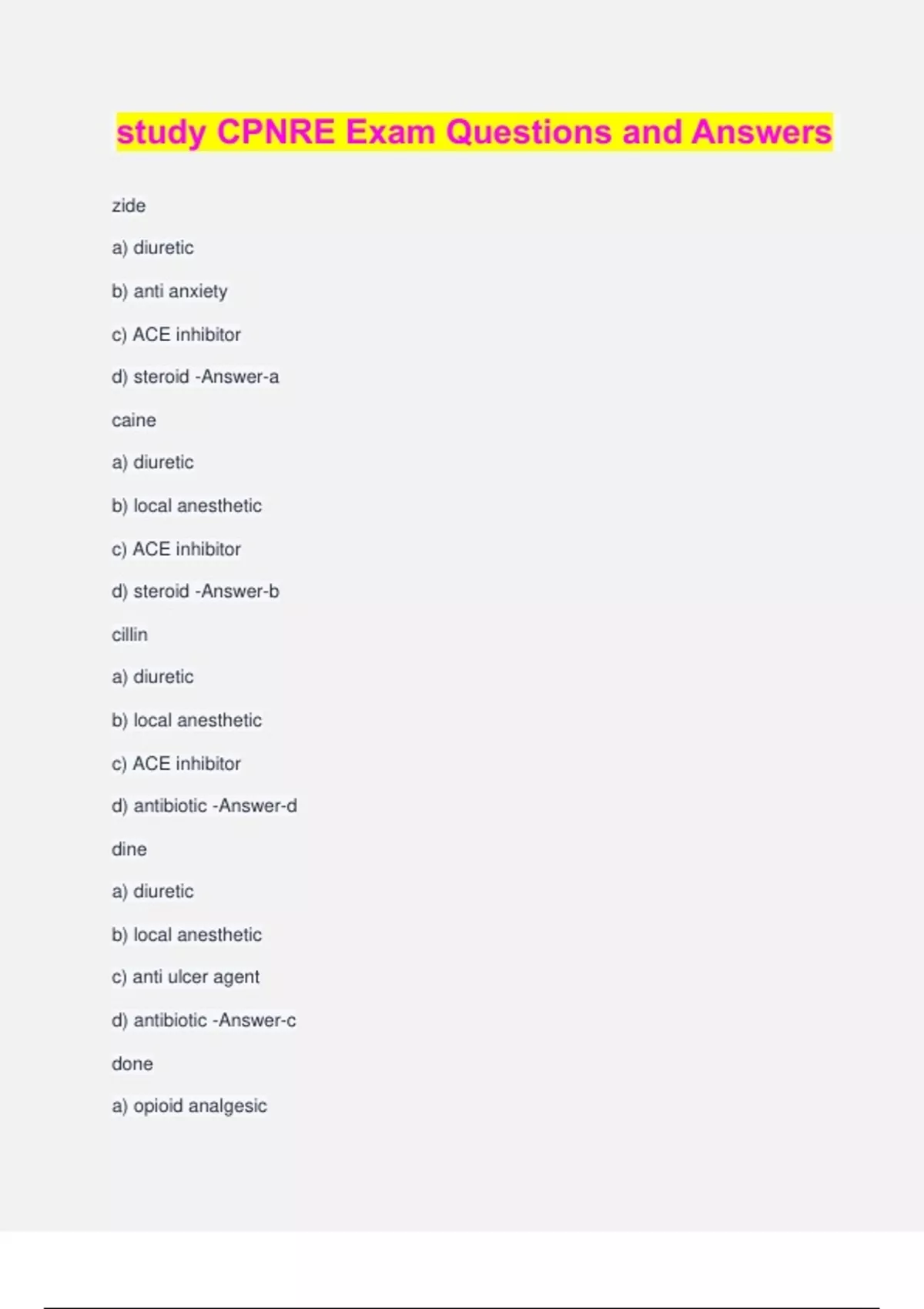 study CPNRE Exam Questions and Answers zide a) diuretic b) anti anxiety c) ACE inhibitor d) steroid -Answer-a caine a) diuretic b) local anesthetic c) ACE inhibitor d) steroid -Answer-b cillin a) diuretic b) local anesthetic c) ACE inhibitor d) antibiotic -Answer-d dine a) diuretic b) local anesthetic c) anti ulcer agent d) antibiotic -Answer-c done a) opioid analgesic b) local anesthetic c) anti ulcer agent d) antibiotic -Answer-a ide a) opioid analgesic b) local anesthetic c) anti ulcer agent d) oral hypoglycemic -Answer-d iam a) opioid analgesic b) anti anxiety c) anti ulcer agent d) oral hypoglycemic -Answer-b
