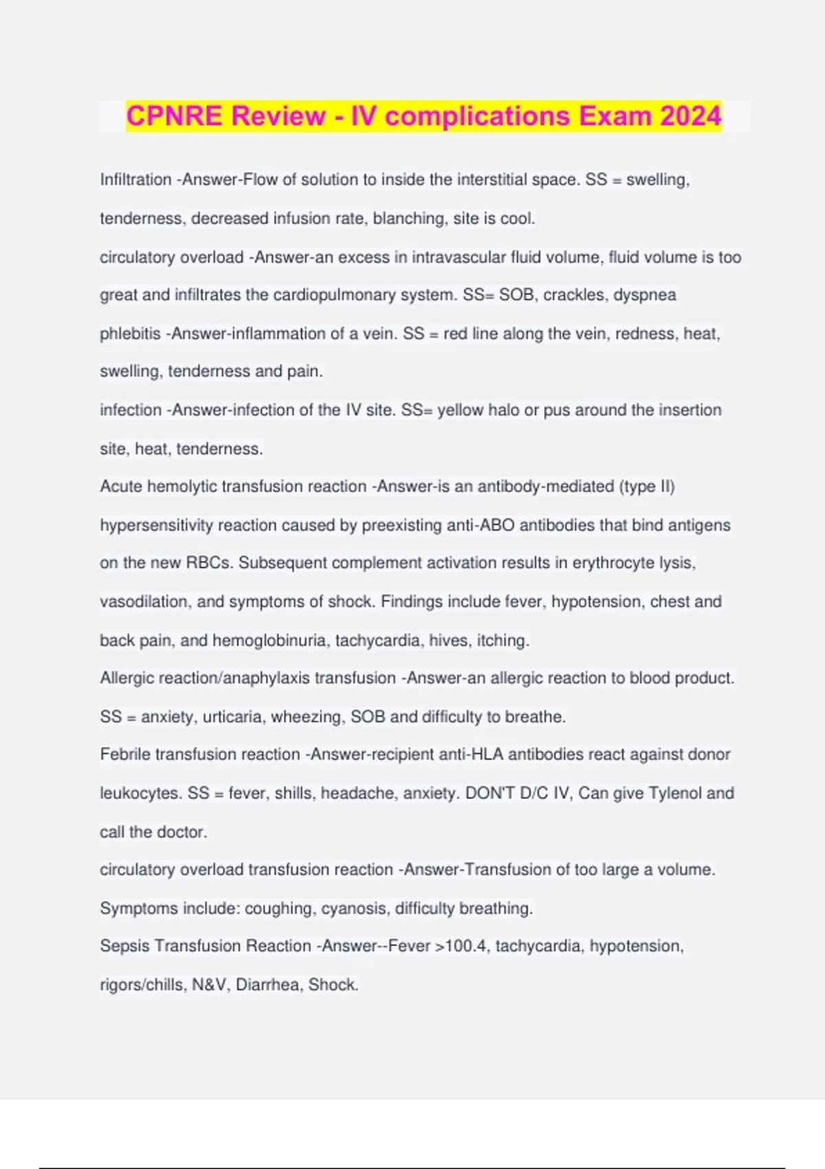 CPNRE Review - IV complications Exam 2024 Infiltration -Answer-Flow of solution to inside the interstitial space. SS = swelling, tenderness, decreased infusion rate, blanching, site is cool. circulatory overload -Answer-an excess in intravascular fluid volume, fluid volume is too great and infiltrates the cardiopulmonary system. SS= SOB, crackles, dyspnea phlebitis -Answer-inflammation of a vein. SS = red line along the vein, redness, heat, swelling, tenderness and pain. infection -Answer-infection of the IV site. SS= yellow halo or pus around the insertion site, heat, tenderness. Acute hemolytic transfusion reaction -Answer-is an antibody-mediated (type II) hypersensitivity reaction caused by preexisting anti-ABO antibodies that bind antigens on the new RBCs. Subsequent complement activation results in erythrocyte lysis, vasodilation, and symptoms of shock. Findings include fever, hypotension, chest and back pain, and hemoglobinuria, tachycardia, hives, itching