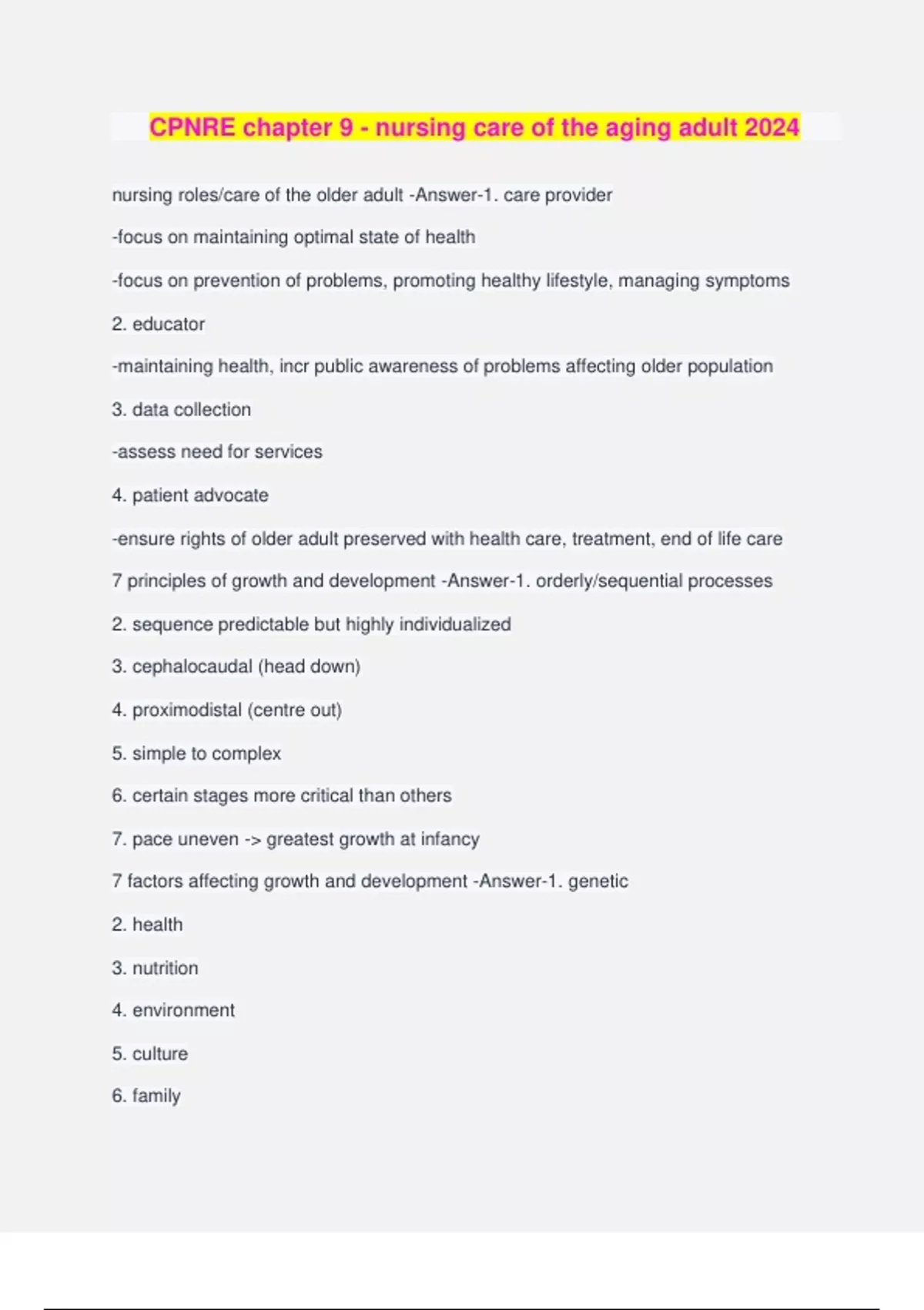 CPNRE chapter 9 - nursing care of the aging adult 2024 nursing roles/care of the older adult -Answer-1. care provider -focus on maintaining optimal state of health -focus on prevention of problems, promoting healthy lifestyle, managing symptoms 2. educator -maintaining health, incr public awareness of problems affecting older population 3. data collection -assess need for services 4. patient advocate -ensure rights of older adult preserved with health care, treatment, end of life care 7 principles of growth and development -Answer-1. orderly/sequential processes 2. sequence predictable but highly individualized 3. cephalocaudal (head down) 4. proximodistal (centre out) 5. simple to complex 6. certain stages more critical than others 7. pace uneven -> greatest growth at infancy 7 factors affecting growth and development -Answer-1. genetic 2. health 3. nutrition 4. environment 5. culture 6. family 7. temperament sociological theories of aging -Answer-1. disengagement 2. activity 3. continuity/development 4. passages disengagement theory -Answer--mutual withdrawal between older adults/society -engagement seen as devotion -supports leisure as form of activity -respects individual initiated withdrawal activity theory -Answer-the more active older adults are, the more likely they are to be satisfied with their lives continuity theory -Answer-people try to maintain same basic structure throughout their lives -as they age, they make decisions to adapt to external/internal changes of envt -ense of inferiority develops if continuity is disrupted passage theory -Answer-life cycle changes can be identified, predicted, planned for and managed biological theories of aging -Answer-1. wear and tear 2. collagen 3. lipofuscin accumulation (type of free radical) 4. immunological responses 5. cell death of genetic programming 6. free radical 7. mutation and error 8. cross link theory 9. neuroendocrine-immunological wear and tear theory -Answer--stress/use depletes body cells of ability to repair -aging results from stress/damage not chronological age collagen theory -Answer--most abundant protein held by molecules -chemical reactions cause switching of bonds that hold the molecules resulting in structural changes that lead to aging lipofuscin theory -Answer--age pigments that are insoluble end products of cell metabolism -when they accumulate they alter the ability of cell to function normally immunological responses theory -Answer--aging is autoimmune disease -cells change/body doesnt recognize own cells -autoimmune responses damage cells and cause cell death cell death of genetic programming theory -Answer--cell reproduction is programmed -biological clock is ticking -programming determines rate/time at which a member of a given species ages/dies free radical theory -Answer--byproducts of cellular activty cause cell errors -smog, ozone, pesticides, radiation, gas incr production of free radicals -antioxidants (vit ACE) reduce free radical activity -damage from free radicals faster than rate cells can repair themselves -> cell death mutation and error theory -Answer--cell division errors occur progressively over time -> radiation a contributing factor -mutated cells altered in function/effectiveness -error theory expands on mutation theory to include errors in interpretation of cell messages cross link theory -Answer-1. proteins in body stiffen -> link with sugar in presence of O2 2. skin dries/less elastic 3. vessels dont expand/contract neuroendocrine-immunological theory -Answer--programmed cell death from free radical damage -cells lose ability to regenerate -reduce T cells that protect body against antigens psychological theories -Answer-erikson -integrity vs despair -elder that views their life as having no meanin