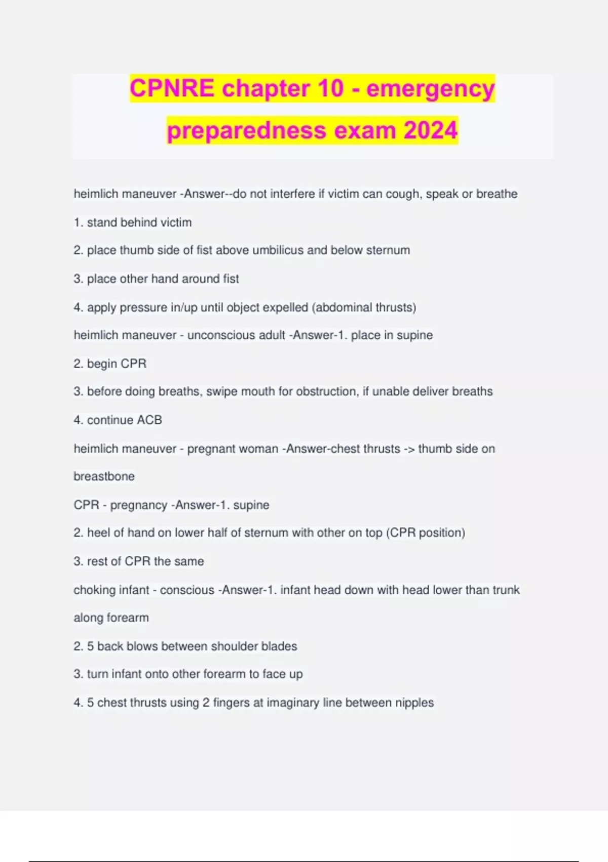 CPNRE chapter 10 - emergency preparedness exam 2024 heimlich maneuver -Answer--do not interfere if victim can cough, speak or breathe 1. stand behind victim 2. place thumb side of fist above umbilicus and below sternum 3. place other hand around fist 4. apply pressure in/up until object expelled (abdominal thrusts) heimlich maneuver - unconscious adult -Answer-1. place in supine 2. begin CPR 3. before doing breaths, swipe mouth for obstruction, if unable deliver breaths 4. continue ACB heimlich maneuver - pregnant woman -Answer-chest thrusts -> thumb side on breastbone CPR - pregnancy -Answer-1. supine 2. heel of hand on lower half of sternum with other on top (CPR position) 3. rest of CPR the same choking infant - conscious -Answer-1. infant head down with head lower than trunk along forearm 2. 5 back blows between shoulder blades 3. turn infant onto other forearm to face up 4. 5 chest thrusts using 2 fingers at imaginary line between nipples choking infant - unconscious -Answer-1. one person -> 30:2 compression 2. two people -> 15:2 compression 3. supine position -> begin compressions 4. after each compression set -> neutral head tilt chin lift, inspect for object 5. establish airway -> head tilt chin lift maneuver 6. 2 breaths 7. continue CPR types of hemorrhage -Answer-1. venous -dark red, steady flow 2. arterial -bright red, spurting flow 3. capillary -red, oozing flow signs of hemorrhagic shock -Answer-1. hypotension & weak rapid pulse 2. restlessness, anxiety, SOB 3. cool clammy pale skin 4. N&V 5. altered LOC 6. if bleeding internal -> pain develops r/t cavity stretching by incr blood volume, may lead to hematemsis external hemorrhage -Answer-1. place in supine if possible 2. direct/firm pressure to injury with heel of hand for at least 10mins 3. place cold compress over bandage to support vasoconstriction 4. elevate injured part above head 5. direct pressure on arterial supply if pressure on area of injury does not stop 6. tourniquet if life threatening -> above wound 7. cover to maintain body temp supply arteries -Answer-1. temporal 2. facial/carotid 3. subclavian (shoulder) 4. brachial 5. radial/ulnar 6. femoral 7. popliteal 8. foot internal hemorrhage -Answer-1. cover victim to maintain body temp 2. supine 3. vitals 4. treat for shock and send for surgery 5. replace fluids (IV) to expand blood volume anaphylactic reaction symptoms -Answer-1. pallor, urticaria, pruritus, rash, edema 2. resp distress, dyspnea, wheezing 3. anxiety/restlessness 4. hypotension, tachycardia anaphylactic reaction treatment -Answer-1. epinephrine 2. antihistamines 3. steroids 4. IV fluids 5. bronchodilators 6. drug therapy for CV support 7. O2 therapy 8. elevate feet slightly unless contraindicated in head/neck/spinal injury shock -Answer-Inadequate tissue perfusion or hypoperfusion -results in impairment of cellular metabolism 5 types of shock -Answer-1. hypovolemic