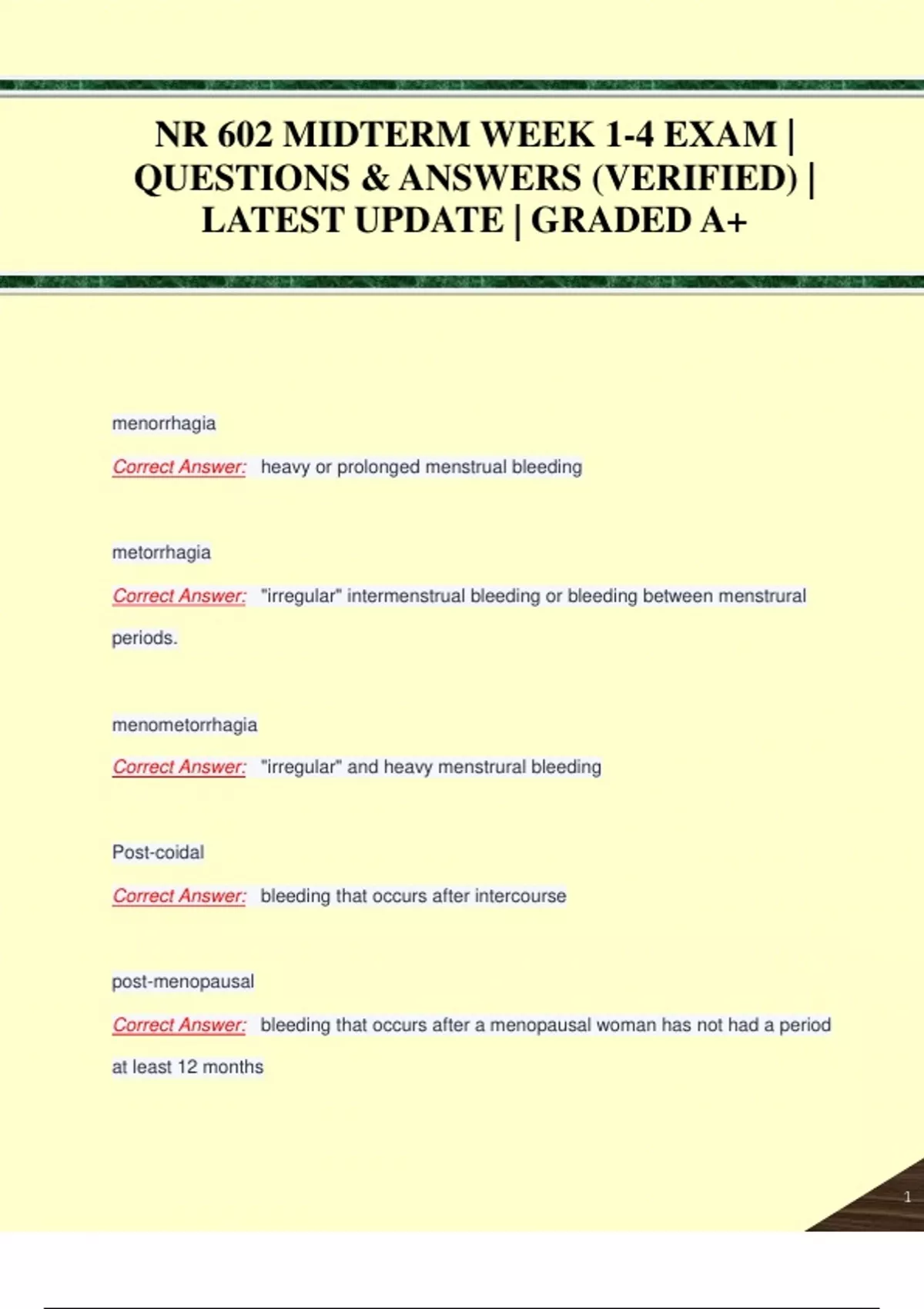 NR 602 MIDTERM WEEK 1-4 EXAM | QUESTIONS & ANSWERS (VERIFIED) | LATEST UPDATE | GRADED A+NR 602 MIDTERM WEEK 1-4 EXAM | QUESTIONS & ANSWERS (VERIFIED) | LATEST UPDATE | GRADED A+
