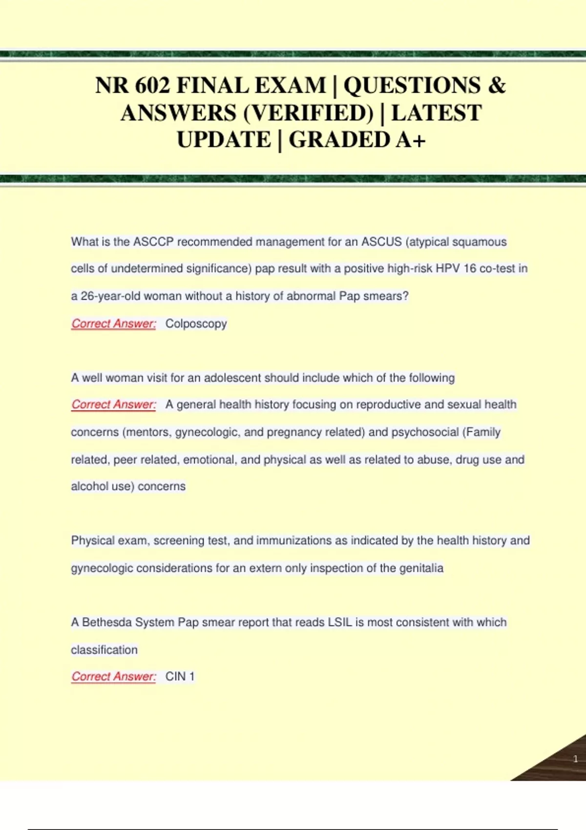 NR 602 FINAL EXAM | QUESTIONS & ANSWERS (VERIFIED) | LATEST UPDATE | GRADED A+NR 602 FINAL EXAM | QUESTIONS & ANSWERS (VERIFIED) | LATEST UPDATE | GRADED A+