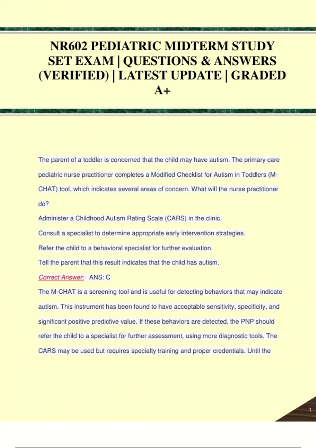 NR602 PEDIATRIC MIDTERM STUDY SET EXAM | QUESTIONS & ANSWERS (VERIFIED) | LATEST UPDATE | GRADED A+NR602 PEDIATRIC MIDTERM STUDY SET EXAM | QUESTIONS & ANSWERS (VERIFIED) | LATEST UPDATE | GRADED A+NR602 PEDIATRIC MIDTERM STUDY SET EXAM | QUESTIONS & ANSWERS (VERIFIED) | LATEST UPDATE | GRADED A+