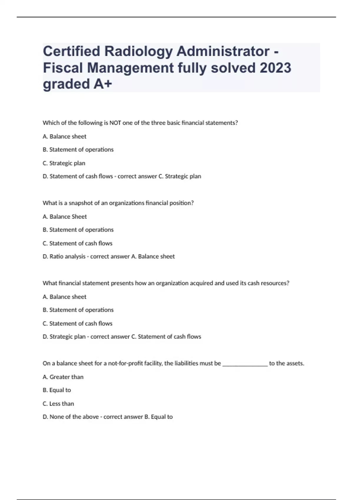 Certified Radiology Administrator - Fiscal Management fully solved 2024 graded A+