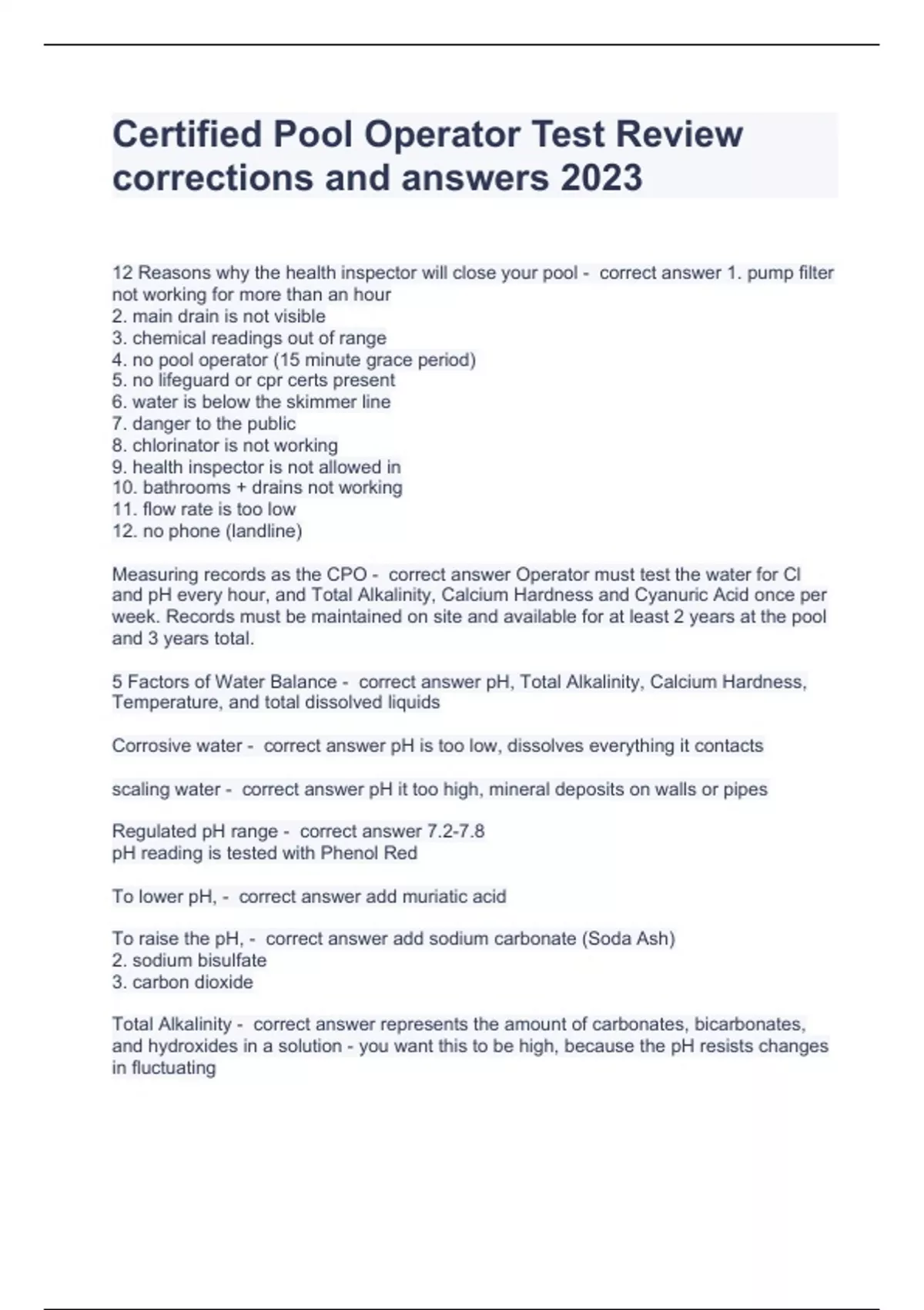 Certified Pool Operator Test Review corrections and answers 2024