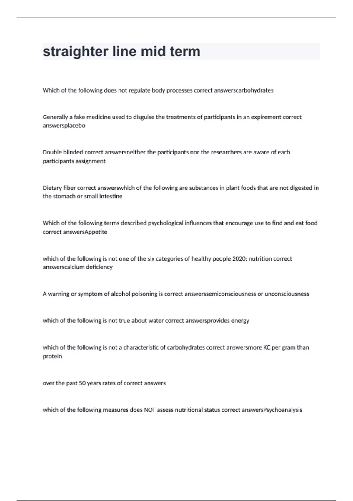 Which of the following does not regulate body processes correct answerscarbohydrates Generally a fake medicine used to disguise the treatments of participants in an expirement correct answersplacebo Double blinded correct answersneither the participants nor the researchers are aware of each participants assignment Dietary fiber correct answerswhich of the following are substances in plant foods that are not digested in the stomach or small intestine Which of the following terms described psychological influences that encourage use to find and eat food correct answersAppetite which of the following is not one of the six categories of healthy people 2020: nutrition correct answerscalcium deficiency A warning or symptom of alcohol poisoning is correct answerssemiconsciousness or unconsciousness which of the following is not true about water correct answersprovides energy which of the following is not a characteristic of carbohydrates correct answersmore KC per gram than protein over the past 50 years rates of correct answers