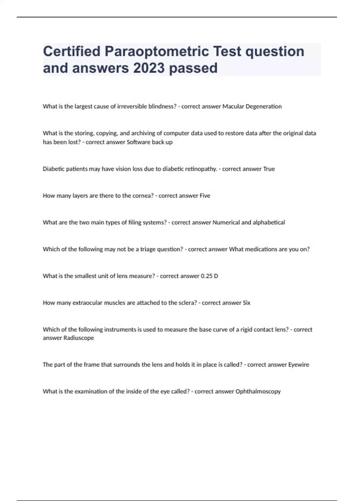 Certified Paraoptometric Test question and answers 2024 passed