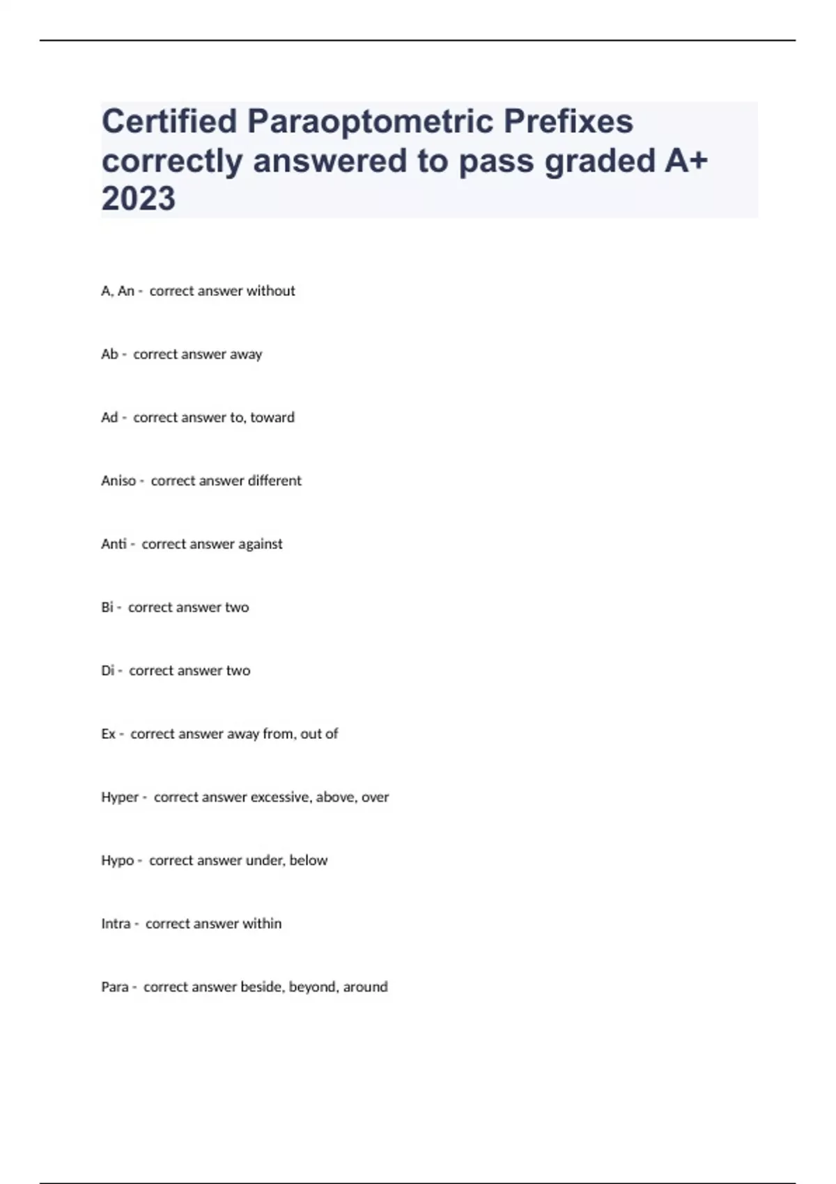 Certified Paraoptometric Prefixes correctly answered to pass graded A+ 2024