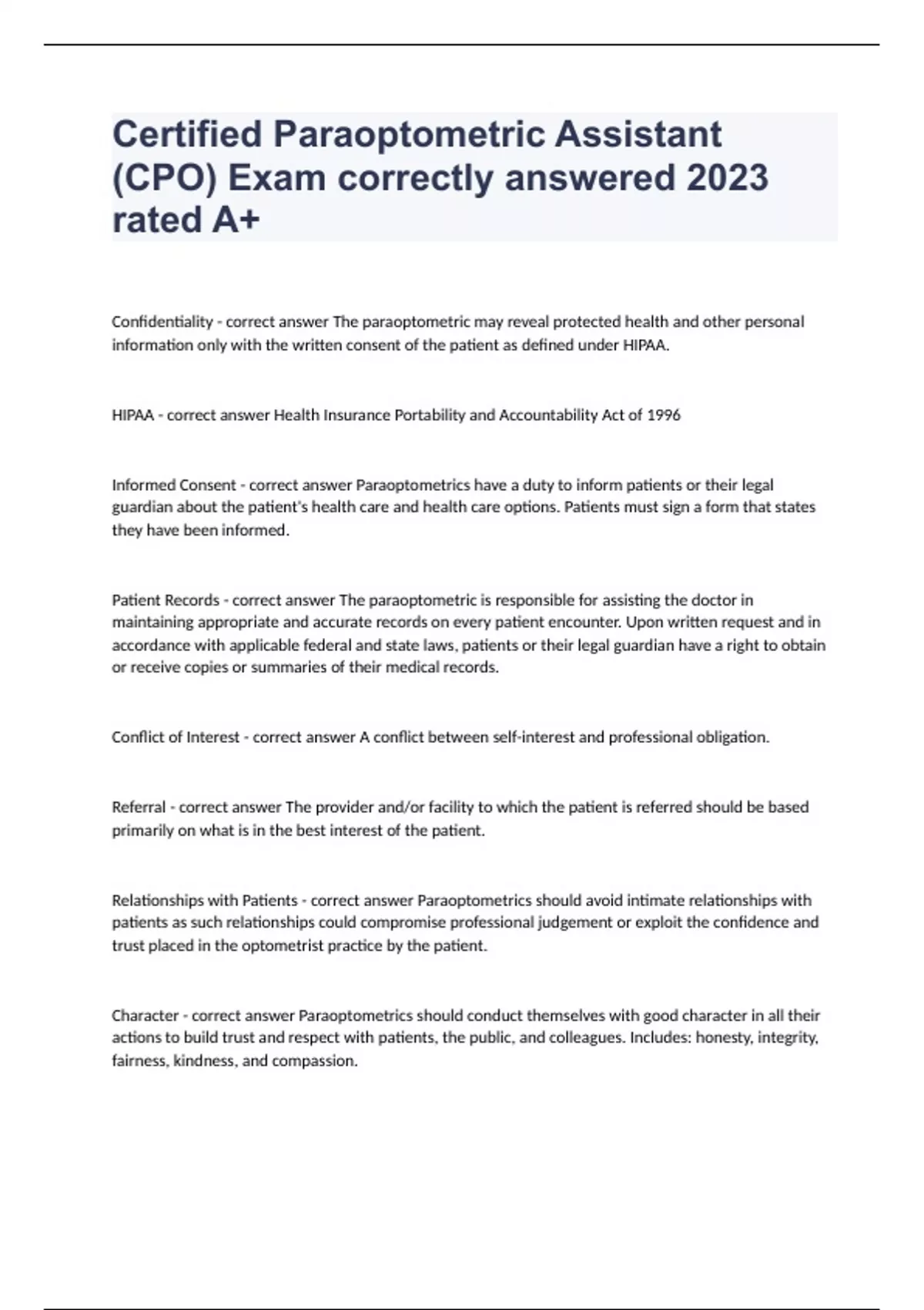Certified Paraoptometric Assistant (CPO) Exam correctly answered 2024 rated A
