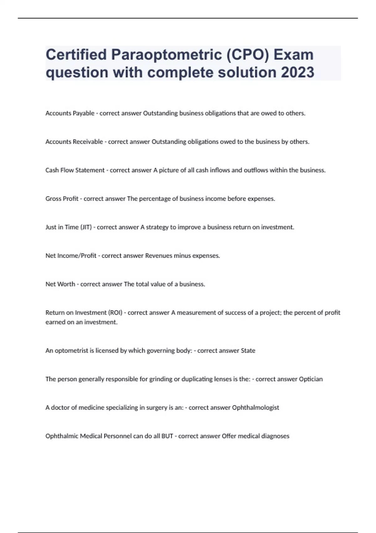 Certified Paraoptometric (CPO) Exam question with complete solution 2024