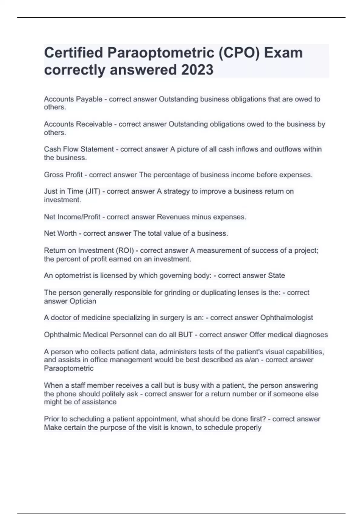 Certified Paraoptometric (CPO) Exam correctly answered 2024