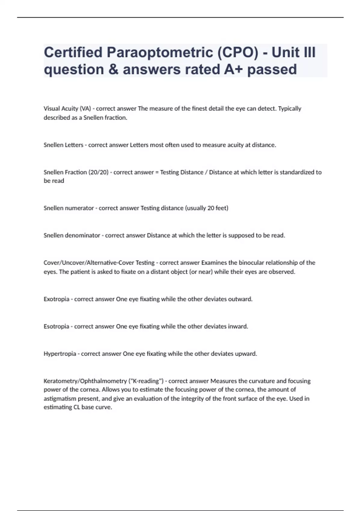 Certified Paraoptometric (CPO) - Unit III question & answers rated A+ passed. 2024