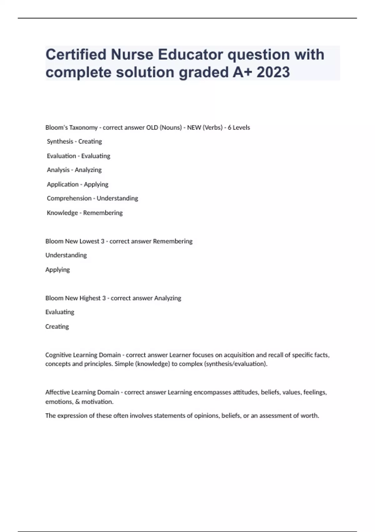Certified Nurse Educator question with complete solution graded A+ 2024