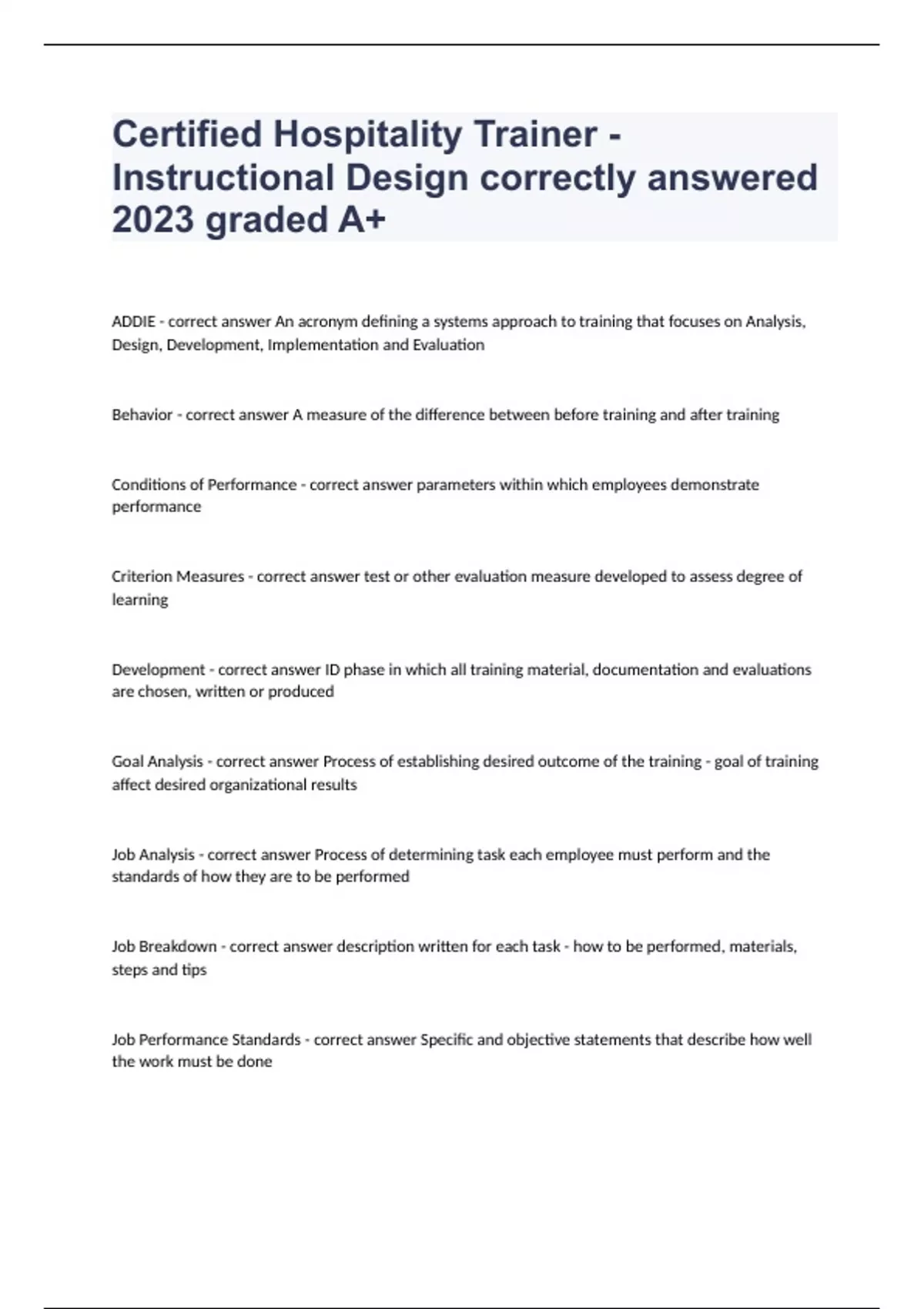 Certified Hospitality Trainer -Instructional Design correctly answered 2024 graded A+.