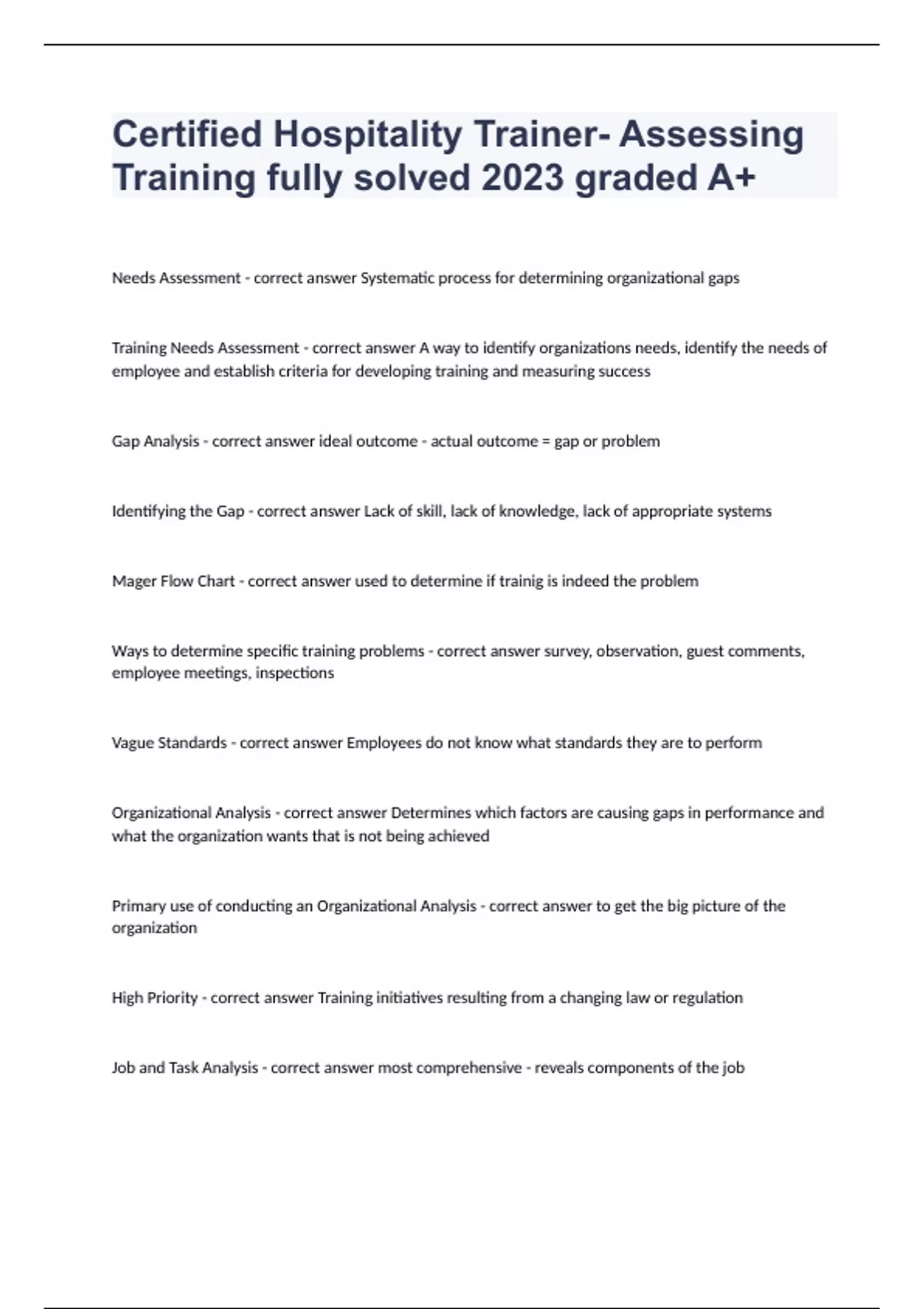 Certified Hospitality Trainer- Assessing Training fully solved 2024 graded A+