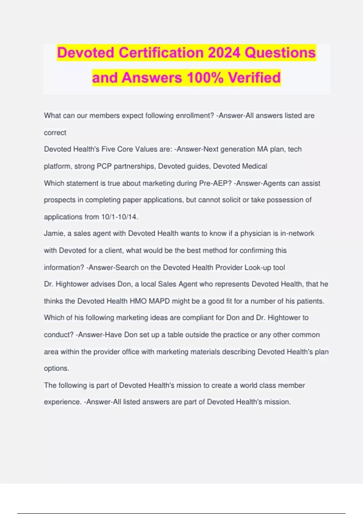 Devoted Certification 2024 Questions and Answers 100% Verified What can our members expect following enrollment? -Answer-All answers listed are correct Devoted Health's Five Core Values are: -Answer-Next generation MA plan, tech platform, strong PCP partnerships, Devoted guides, Devoted Medical Which statement is true about marketing during Pre-AEP? -Answer-Agents can assist prospects in completing paper applications, but cannot solicit or take possession of applications from 10/1-10/14. Jamie, a sales agent with Devoted Health wants to know if a physician is in-network with Devoted for a client, what would be the best method for confirming this information? -Answer-Search on the Devoted Health Provider Look-up tool Dr. Hightower advises Don, a local Sales Agent who represents Devoted Health, that he thinks the Devoted Health HMO MAPD might be a good fit for a number of his patients. Which of his following marketing ideas are compliant for Don and Dr. Hightower to conduct? -Answer-Have Don set up a table outside the practice or any other common area within the provider office with marketing materials describing Devoted Health's plan options. The following is part of Devoted Health's mission to create a world class member experience. -Answer-All listed answers are part of Devoted Health's mission