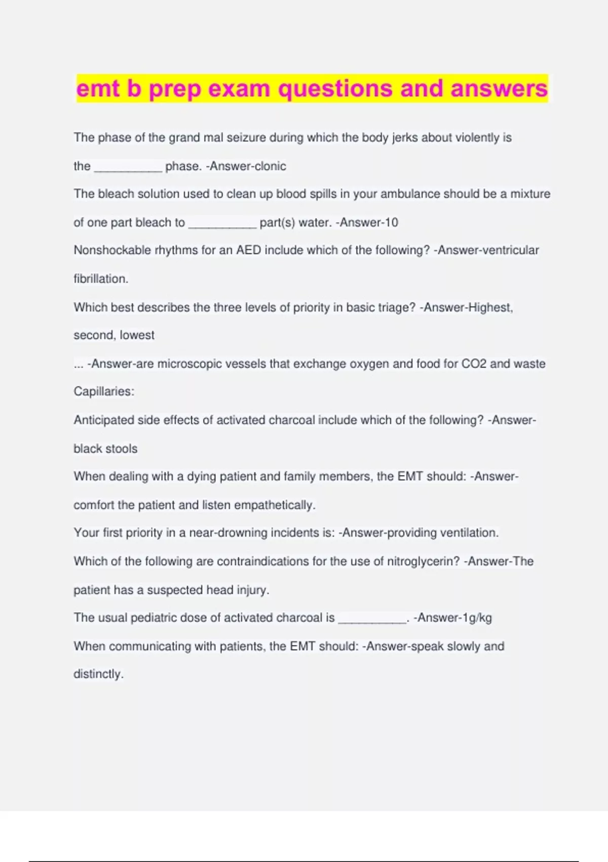 emt b prep exam questions and answers The phase of the grand mal seizure during which the body jerks about violently is the __________ phase. -Answer-clonic The bleach solution used to clean up blood spills in your ambulance should be a mixture of one part bleach to __________ part(s) water. -Answer-10 Nonshockable rhythms for an AED include which of the following? -Answer-ventricular fibrillation. Which best describes the three levels of priority in basic triage? -Answer-Highest, second, lowest ... -Answer-are microscopic vessels that exchange oxygen and food for CO2 and waste Capillaries: Anticipated side effects of activated charcoal include which of the following? -Answer- black stools When dealing with a dying patient and family members, the EMT should: -Answer- comfort the patient and listen empathetically. Your first priority in a near-drowning incidents is: -Answer-providing ventilation. Which of the following are contraindications for the use of nitroglycerin? -Answer-The patient has a suspected head injury. The usual pediatric dose of activated charcoal is __________. -Answer-1g/kg When communicating with patients, the EMT should: -Answer-speak slowly and distinctly. There are two common postures that indicate the patient is trying to increase air flow; the most commonly seen in children is the: -Answer-sniffing position. Using the Rule of Nines, the chest, abdomen, right arm and right leg account for __________ percent of BSA in an adult. -Answer-45 Heat cramps are caused by: -Answer-a loss of too much salt/electrolytes through profuse sweating. Diabetic ketoacidosis (DKA) is a result of: -Answer-hyperglycemia. The first step in the care of a patient with an altered level of consciousness is to: - Answer-assure the patient has a patent airway. A sign of hypoglycemia would be: -Answer-cold, clammy skin. The body's largest artery is the: -Answer-aorta Which is an EMT-Basic role in organ harvesting? -Answer-Providing care to maintain viable organs You arrive at the scene of a woman in labor. Your initial assessment reveals the head of the infant has already delivered. To assist in the delivery of the anterior shoulder, you would: -Answer-gently guide the infant's head downward Which of the following is needed for large splash situations? -Answer-Gown Which of the following is a complication associated with orotracheal intubation? - Answer-. Esophageal placement Which of the following usually results in a slow heart rate? -Answer-Head injury