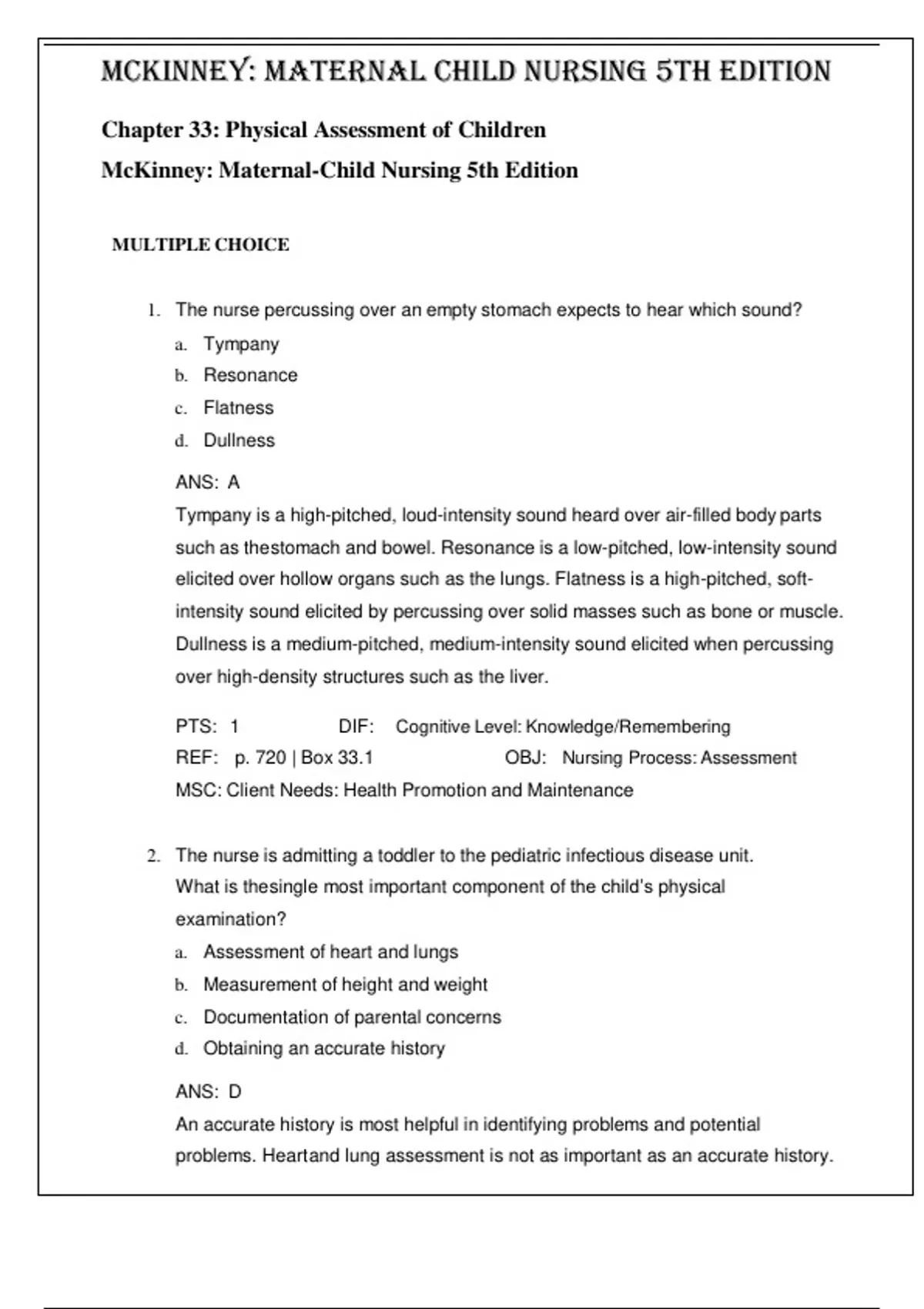 Maternal Child Nursing 5th Edition by McKinney- ISBN- 978-0323401708 TEST BANK Chapter 33: Physical Assessment of Children Verified 2024 Practice Questions and 100% Correct Answers with Explanations for Exam Preparation, Graded A+ The nurse percussing over an empty stomach expects to hear which sound? a. Tympany b. Resonance c. Flatness d. Dullness ANS: A Tympany is a high-pitched, loud-intensity sound heard over air-filled body parts such as thestomach and bowel. Resonance is a low-pitched, low-intensity sound elicited over hollow organs such as the lungs. Flatness is a high-pitched, softintensity sound elicited by percussing over solid masses such as bone or muscle. Dullness is a medium-pitched, medium-intensity sound elicited when percussing over high-density structures such as the liver. PTS: 1 DIF: Cognitive Level: Knowledge/Remembering REF: p. 720 | Box 33.1 OBJ: Nursing Process: Assessment MSC: Client Needs: Health Promotion and Maintenance 2. The nurse is admitting a toddler to the pediatric infectious disease unit. What is thesingle most important component of the child’s physical examination? a. Assessment of heart and lungs b. Measurement of height and weight c. Documentation of parental concerns d. Obtaining an accurate history ANS: D An accurate history is most helpful in identifying problems and potential problems. Heartand lung assessment is not as important as an accurate history. A single measurement of height and weight is not as significant as determining growth over time. The child’s growth pattern can be elicited from the history. Documentation of parental concerns is notas relevant to the physical examination as an accurate history in this case. PTS: 1 DIF: Cognitive Level: Comprehension/Understanding REF: p. 720 | Box 33.1 OBJ: Nursing Process: AssessmentMSC: Client Needs: Physiologic Integrity