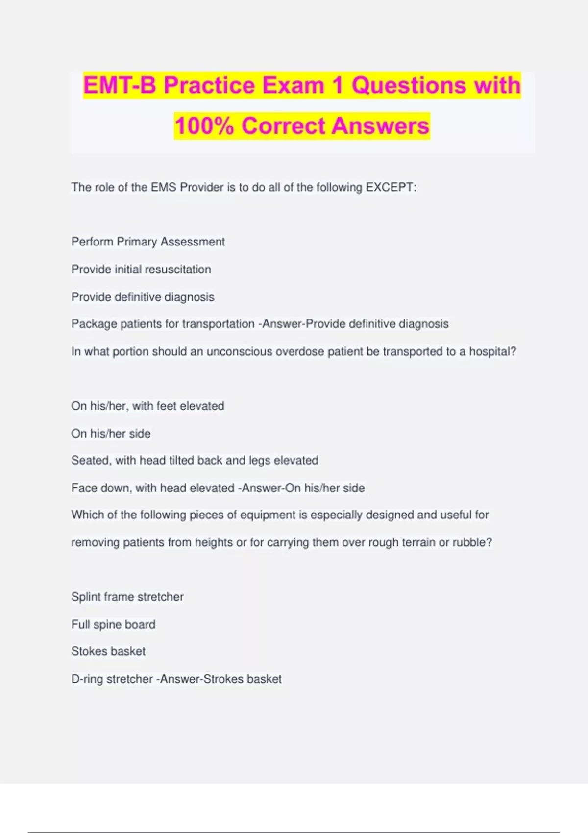 EMT-B Practice Exam 1 Questions with 100% Correct Answers The role of the EMS Provider is to do all of the following EXCEPT: Perform Primary Assessment Provide initial resuscitation Provide definitive diagnosis Package patients for transportation -Answer-Provide definitive diagnosis In what portion should an unconscious overdose patient be transported to a hospital? On his/her, with feet elevated On his/her side Seated, with head tilted back and legs elevated Face down, with head elevated -Answer-On his/her side Which of the following pieces of equipment is especially designed and useful for removing patients from heights or for carrying them over rough terrain or rubble? Splint frame stretcher Full spine board Stokes basket D-ring stretcher -Answer-Strokes basket The prehospital care report (PCR) is considered to be: A part of the patients hospital chart A matter of public record Inadmissible in a court of law A research document only -Answer-A part of the patients hospital chart EMS providers must be certified to perform legally at their level of training. The New York State law that establishes this level is the: Good Samaritan Law General Municipal Law Medical License Law Public Health Law -Answer-Public Health Law If consent is refused by a conscious and mentally competent adult, that person CANNOT be treated without: Consent from the immediate family A court of order Consent from the police Orders from Medical Control -Answer-Orders from medical control You are called to a rural home by the mother of a 4-year-old girl. Upon arrival, you begin to treat a dog-bite wound on the girls arm when the girl's father comes into the house and tells you to leave her alone. The mother asks you to continue your care of the child. Faced with the situation above, you should: Separate both patents from the child and sort out consent issue Continue care of the girl in her mother's presence and notify police Call the children services division of the state for permission to continue care Immediately cease care of the child according to her father's wishes -Answer-Continue care of the girl in her mother's presence and notify police Providing care within the scope practice would be considered to be an accordance with: The sovereign immunity doctrine State law Professional conduct Institutional Standards -Answer-State law An accident victim who is a minor has blood spurting from the brachial artery. The parents are not present. Which one of the following actions should the EMS provider take? Contact the receiving hospital by radio for permission to proceed with treatment Get permission from the police to proceed with treatment Take the child to the hospital but provide no treatment Presume that parental consent is implied and proceed with treatment -Answer-Presume that parental consent is implied and proceed with treatment You are called to the residence of a 74-year-old female who has fallen and has a large area of ecchymosis on her left hip. You are met by a neighbor, who was caring for the patient while her daughter was out of town. The neighbor explains that the patient has a history of Alzheimer's and presents a NYS Department of Health Non-Hospital Order Not to Resuscitate (DNR) form. This patient is unable to communicate, so you should: Contact Medical control to have the DNR order overridden Treat the patient for a potential hip fracture Explain to the neighbor that the patient cannot be treated since there is no one present to give informed consent Explain to the neighbor that a DNR prevents the patient from being treated and suggest that the neighbor contact the issuing physician to have the order canceled -Answer- Treat the patient for a potential hip fracture Approximately how many liters of blood does an adult male weighing 150 lb have in his body? 3 liters 4 liters 6 liters 7 liters -Answer-6 liter