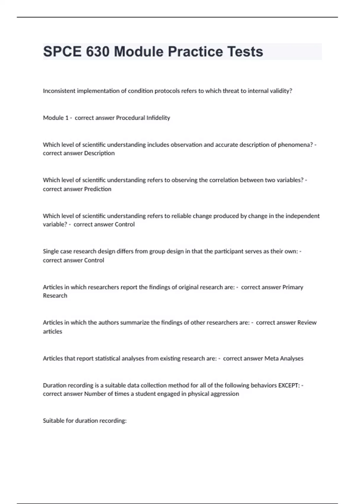 SPCE 630 Module Practice TestsInconsistent implementation of condition protocols refers to which threat to internal validity? Module 1 - correct answer Procedural Infidelity Which level of scientific understanding includes observation and accurate description of phenomena? - correct answer Description Which level of scientific understanding refers to observing the correlation between two variables? - correct answer Prediction Which level of scientific understanding refers to reliable change produced by change in the independent variable? - correct answer Control Single case research design differs from group design in that the participant serves as their own: - correct answer Control Articles in which researchers report the findings of original research are: - correct answer Primary Research Articles in which the authors summarize the findings of other researchers are: - correct answer Review articles Articles that report statistical analyses from existing research are: - correct answer Meta Analyses Duration recording is a suitable data collection method for all of the following behaviors EXCEPT: - correct answer Number of times a student engaged in physical aggression