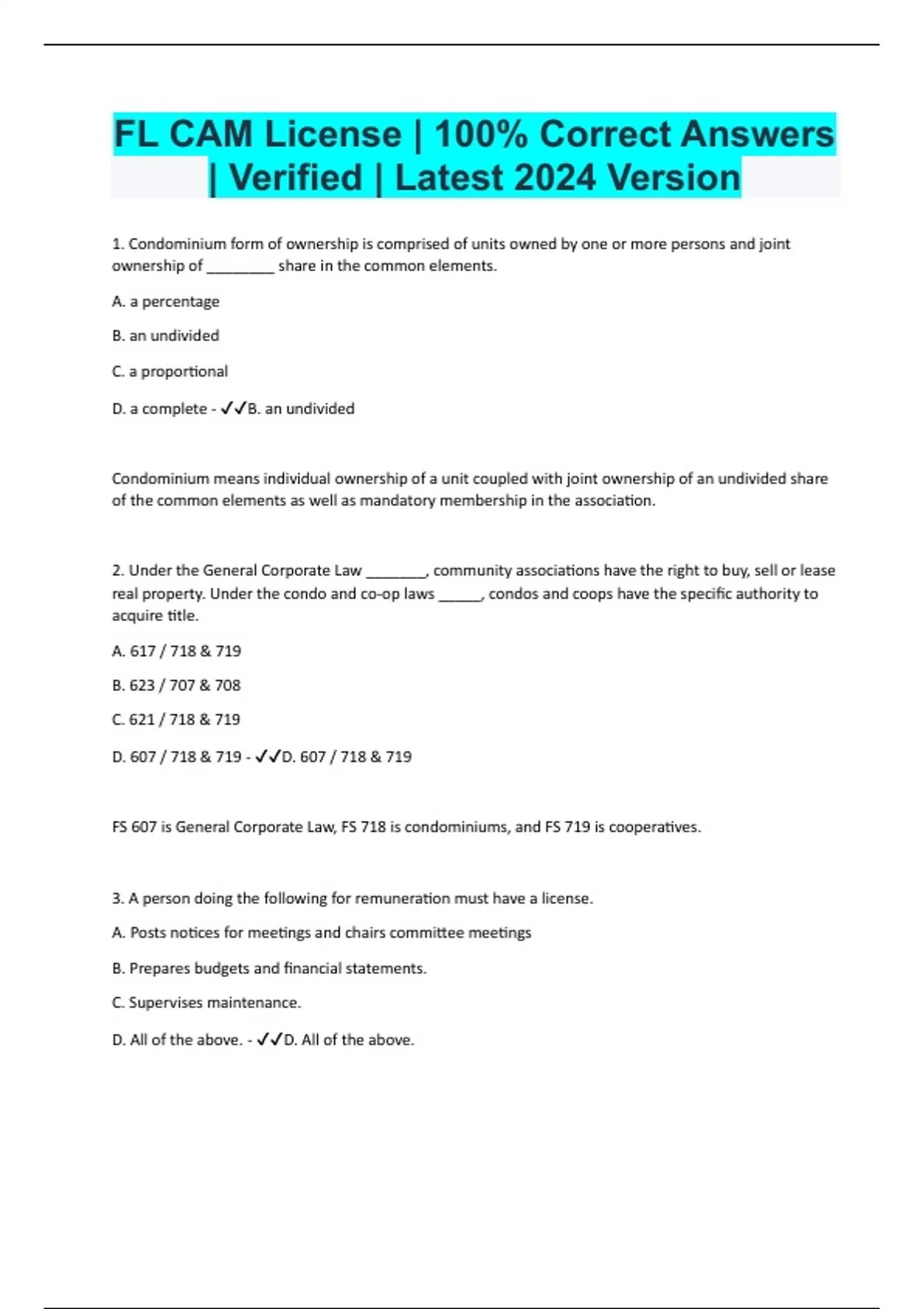 1. Condominium form of ownership is comprised of units owned by one or more persons and joint ownership of ________ share in the common elements. A. a percentage B. an undivided C. a proportional D. a complete - B. an undivided Condominium means individual ownership of a unit coupled with joint ownership of an undivided share of the common elements as well as mandatory membership in the association. 2. Under the General Corporate Law _______, community associations have the right to buy, sell or lease real property. Under the condo and co-op laws _____, condos and coops have the specific authority to acquire title. A. 617 / 718 & 719 B. 623 / 707 & 708 C. 621 / 718 & 719 D. 607 / 718 & 719 - D. 607 / 718 & 719 FS 607 is General Corporate Law, FS 718 is condominiums, and FS 719 is cooperatives. 3. A person doing the following for remuneration must have a license. A. Posts notices for meetings and chairs committee meetings B. Prepares budgets and financial statements. C. Supervises maintenance. D. All of the above. - D. All of the above.