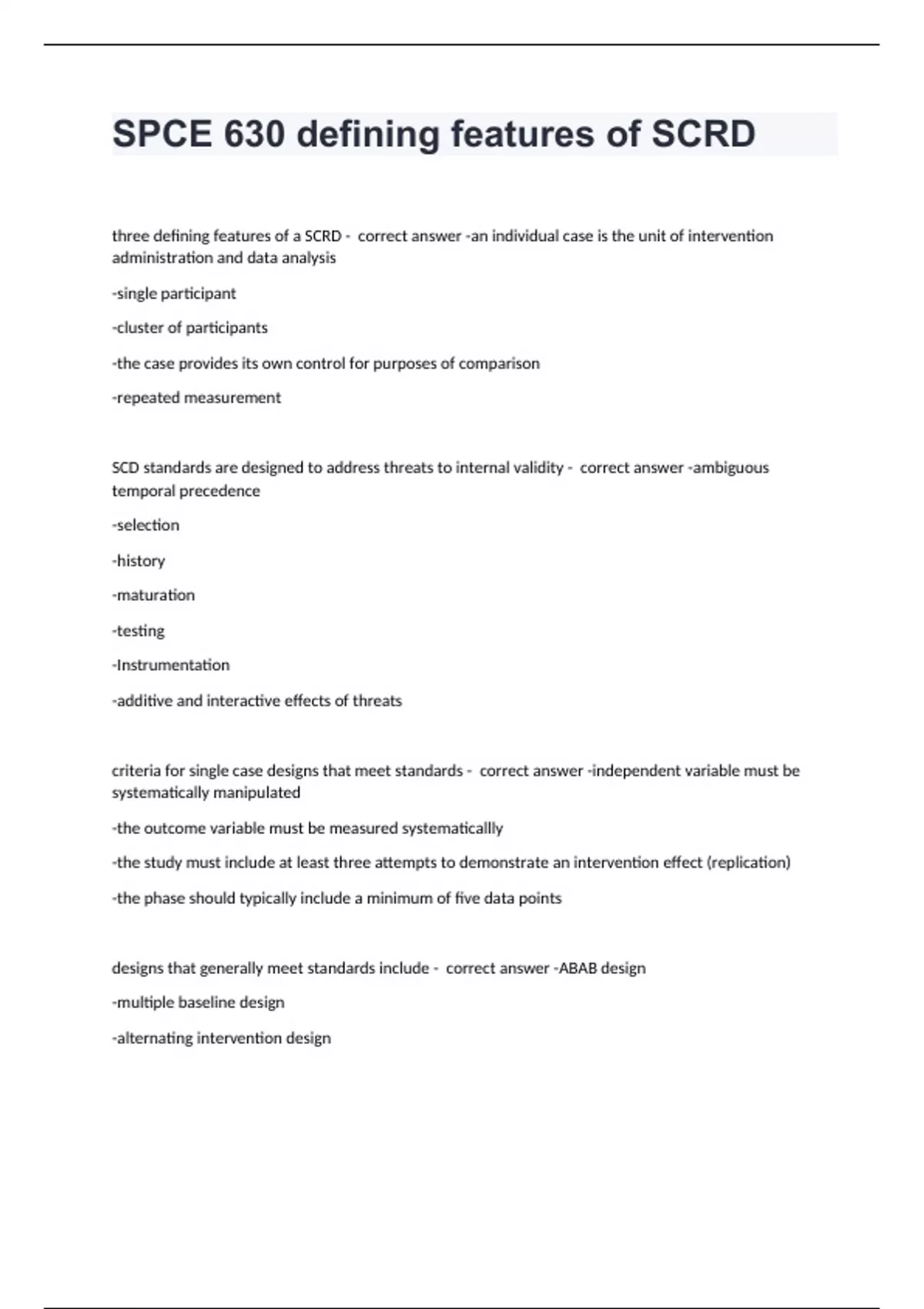 SPCE 630 defining features of SCRD three defining features of a SCRD - correct answer -an individual case is the unit of intervention administration and data analysis -single participant -cluster of participants -the case provides its own control for purposes of comparison -repeated measurement SCD standards are designed to address threats to internal validity - correct answer -ambiguous temporal precedence -selection -history -maturation -testing -Instrumentation -additive and interactive effects of threats criteria for single case designs that meet standards - correct answer -independent variable must be systematically manipulated -the outcome variable must be measured systematicallly -the study must include at least three attempts to demonstrate an intervention effect (replication) -the phase should typically include a minimum of five data points designs that generally meet standards include - correct answer -ABAB design -multiple baseline design -alternating intervention design