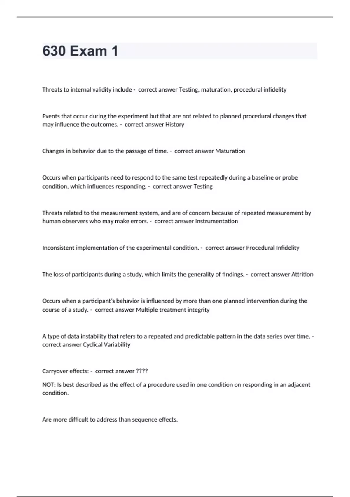 630 Exam 1 Threats to internal validity include - correct answer Testing, maturation, procedural infidelity Events that occur during the experiment but that are not related to planned procedural changes that may influence the outcomes. - correct answer History Changes in behavior due to the passage of time. - correct answer Maturation Occurs when participants need to respond to the same test repeatedly during a baseline or probe condition, which influences responding. - correct answer Testing Threats related to the measurement system, and are of concern because of repeated measurement by human observers who may make errors. - correct answer Instrumentation Inconsistent implementation of the experimental condition. - correct answer Procedural Infidelity The loss of participants during a study, which limits the generality of findings. - correct answer Attrition Occurs when a participant's behavior is influenced by more than one planned intervention during the course of a study. - correct answer Multiple treatment integrity A type of data instability that refers to a repeated and predictable pattern in the data series over time. - correct answer Cyclical Variability Carryover effects: - correct answer ???? NOT: Is best described as the effect of a procedure used in one condition on responding in an adjacent condition.