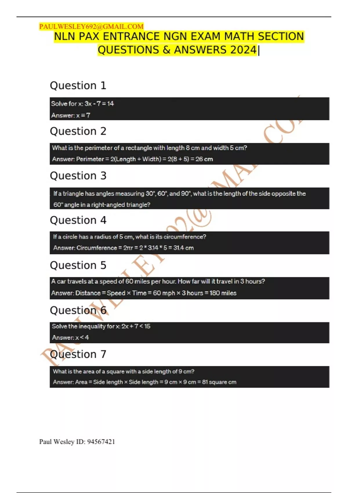 NLN PAX ENTRANCE NGN EXAM MATH SECTION QUESTIONS & ANSWERS 2024|