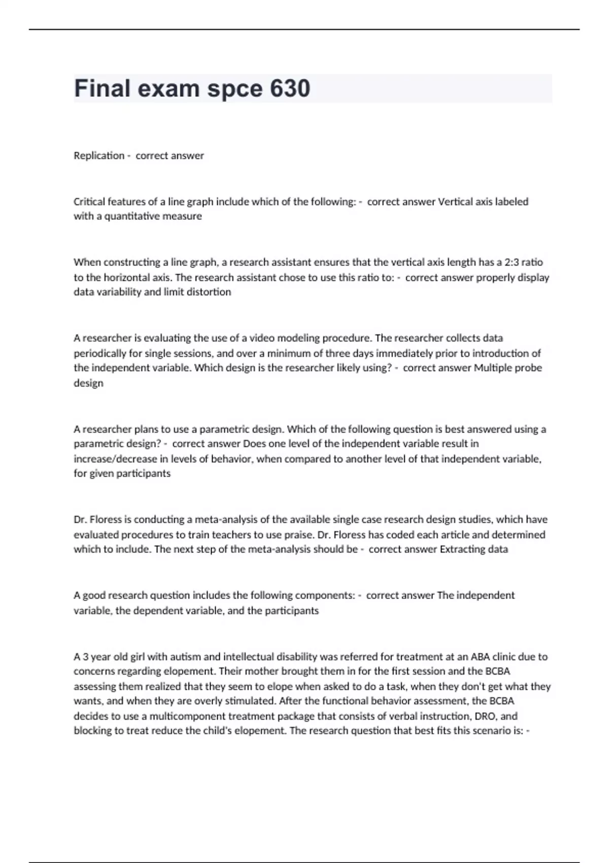 Final exam spce 630 Replication - correct answer Critical features of a line graph include which of the following: - correct answer Vertical axis labeled with a quantitative measure When constructing a line graph, a research assistant ensures that the vertical axis length has a 2:3 ratio to the horizontal axis. The research assistant chose to use this ratio to: - correct answer properly display data variability and limit distortion A researcher is evaluating the use of a video modeling procedure. The researcher collects data periodically for single sessions, and over a minimum of three days immediately prior to introduction of the independent variable. Which design is the researcher likely using? - correct answer Multiple probe design A researcher plans to use a parametric design. Which of the following question is best answered using a parametric design? - correct answer Does one level of the independent variable result in increase/decrease in levels of behavior, when compared to another level of that independent variable, for given participants Dr. Floress is conducting a meta-analysis of the available single case research design studies, which have evaluated procedures to train teachers to use praise. Dr. Floress has coded each article and determined which to include. The next step of the meta-analysis should be - correct answer Extracting data A good research question includes the following components: - correct answer The independent variable, the dependent variable, and the participants A 3 year old girl with autism and intellectual disability was referred for treatment at an ABA clinic due to concerns regarding elopement. Their mother brought them in for the first session and the BCBA assessing them realized that they seem to elope when asked to do a task, when they don't get what they wants, and when they are overly stimulated. After the functional behavior assessment, the BCBA decides to use a multicomponent treatment package that consists of verbal instruction, DRO, and blocking to treat reduce the child's elopement. The research question that best fits this scenario is: -