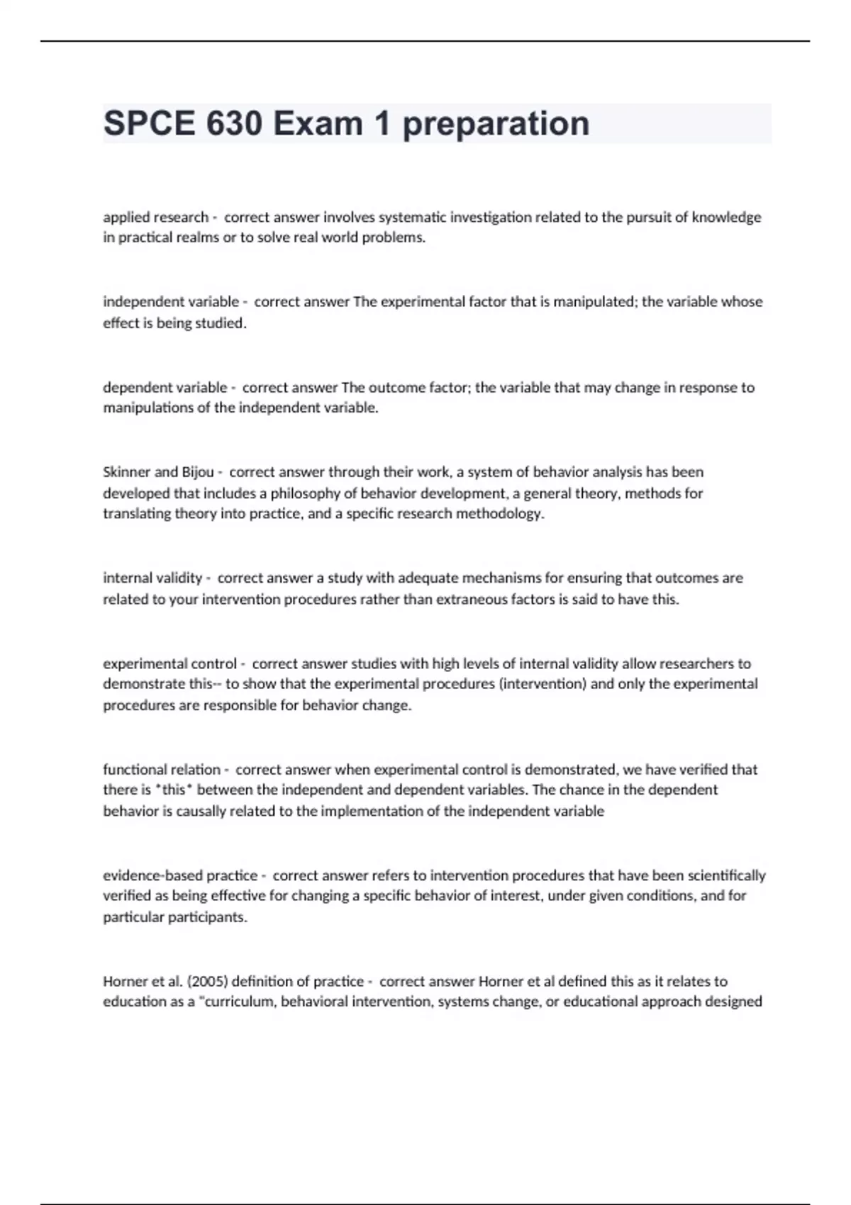 SPCE 630 Exam 1 preparationapplied research - correct answer involves systematic investigation related to the pursuit of knowledge in practical realms or to solve real world problems. independent variable - correct answer The experimental factor that is manipulated; the variable whose effect is being studied. dependent variable - correct answer The outcome factor; the variable that may change in response to manipulations of the independent variable. Skinner and Bijou - correct answer through their work, a system of behavior analysis has been developed that includes a philosophy of behavior development, a general theory, methods for translating theory into practice, and a specific research methodology. internal validity - correct answer a study with adequate mechanisms for ensuring that outcomes are related to your intervention procedures rather than extraneous factors is said to have this. experimental control - correct answer studies with high levels of internal validity allow researchers to demonstrate this-- to show that the experimental procedures (intervention) and only the experimental procedures are responsible for behavior change. functional relation - correct answer when experimental control is demonstrated, we have verified that there is *this* between the independent and dependent variables. The chance in the dependent behavior is causally related to the implementation of the independent variable evidence-based practice - correct answer refers to intervention procedures that have been scientifically verified as being effective for changing a specific behavior of interest, under given conditions, and for particular participants. Horner et al. (2005) definition of practice - correct answer Horner et al defined this as it relates to education as a "curriculum, behavioral intervention, systems change, or educational approach designed to be used by families, educators, or students with the express expectation that implementation will result in measurable educational, social, behavioral, or physical benefit. what constitutes evidence that supports implementation of a particular practice? - correct answer the research question should determine the research method (group, single case, or qualitative) and design chosen. credibility of research findings is based on the rigor of the scientific method employed and the extent to which the research design controls for alternative explanations. reliability - correct answer Ability of a test to yield very similar scores for the same individual over repeated testings What Works Clearinghouse (WWC) - correct answer The US department of education's institute of education sciences established *this*, which informs stakeholders by providing a source of information regarding scientific evidence of effectiveness for education practices that could be used to encourage making informed and data based decisions and in turn improve child outcomes. experimental studies - correct answer include descriptions of the target behavior/s b) predictions regarding what impact the independent variable will have on the dependent variable, and c) appropriate tests to see if the prediction is correct. what differentness an experimental design study from a quasi-experimental design study - correct answer the extent to which the design controls for threats to internal validity- variables other than the planned independent variable that could result in changes in the dependent variable threats to internal validity - correct answer History Maturation Testing Instrumentation Diffusion of treatment Regression towards the mean Selection bias Attrition