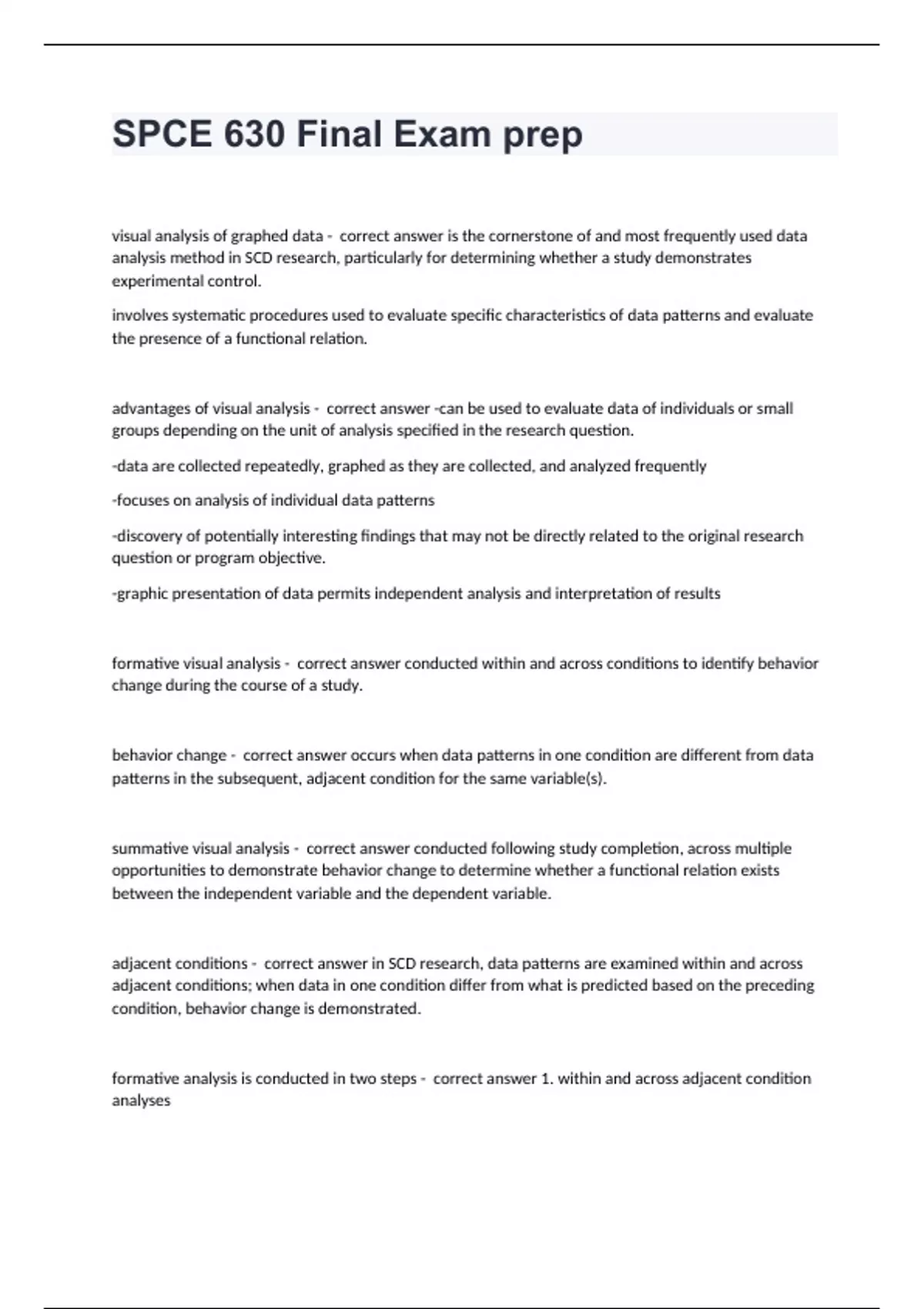 SPCE 630 Final Exam prepvisual analysis of graphed data - correct answer is the cornerstone of and most frequently used data analysis method in SCD research, particularly for determining whether a study demonstrates experimental control. involves systematic procedures used to evaluate specific characteristics of data patterns and evaluate the presence of a functional relation. advantages of visual analysis - correct answer -can be used to evaluate data of individuals or small groups depending on the unit of analysis specified in the research question. -data are collected repeatedly, graphed as they are collected, and analyzed frequently -focuses on analysis of individual data patterns -discovery of potentially interesting findings that may not be directly related to the original research question or program objective. -graphic presentation of data permits independent analysis and interpretation of results formative visual analysis - correct answer conducted within and across conditions to identify behavior change during the course of a study. behavior change - correct answer occurs when data patterns in one condition are different from data patterns in the subsequent, adjacent condition for the same variable(s). summative visual analysis - correct answer conducted following study completion, across multiple opportunities to demonstrate behavior change to determine whether a functional relation exists between the independent variable and the dependent variable. adjacent conditions - correct answer in SCD research, data patterns are examined within and across adjacent conditions; when data in one condition differ from what is predicted based on the preceding condition, behavior change is demonstrated. formative analysis is conducted in two steps - correct answer 1. within and across adjacent condition analyses