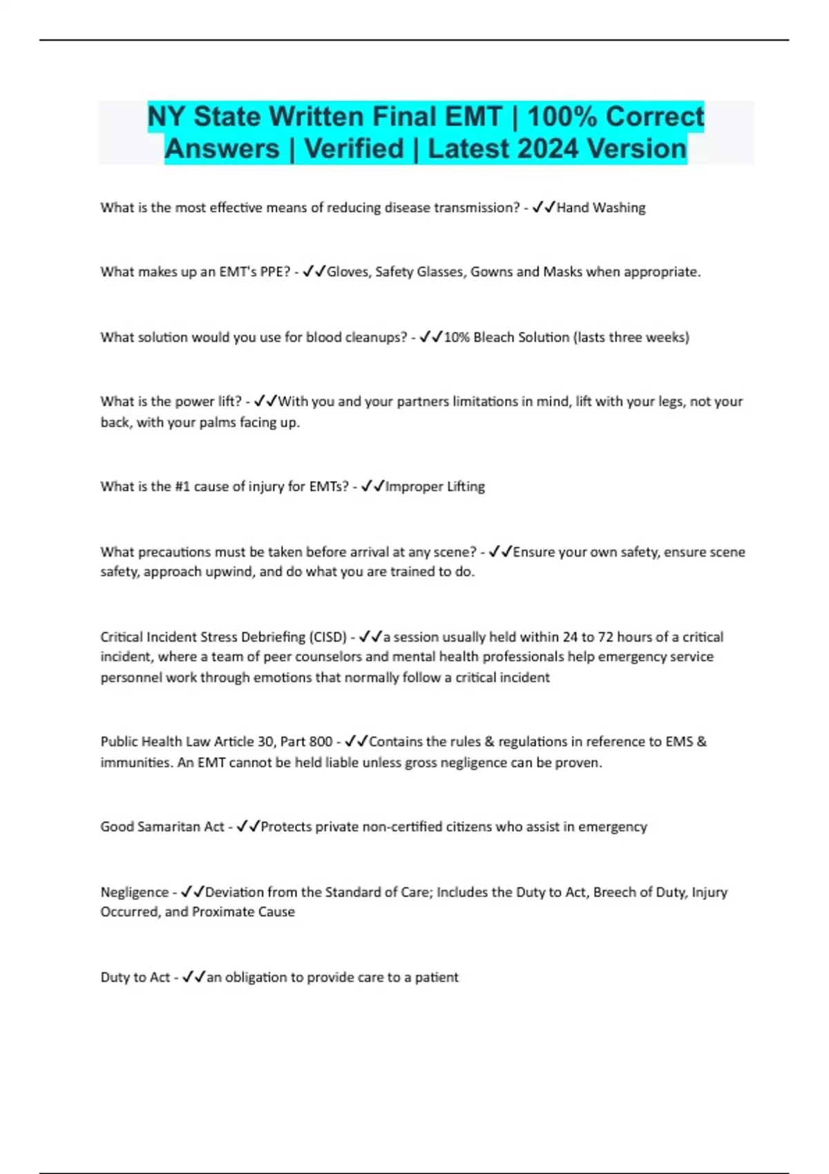 NY State Written Final EMT | 100% Correct Answers | Verified | Latest 2024 Version