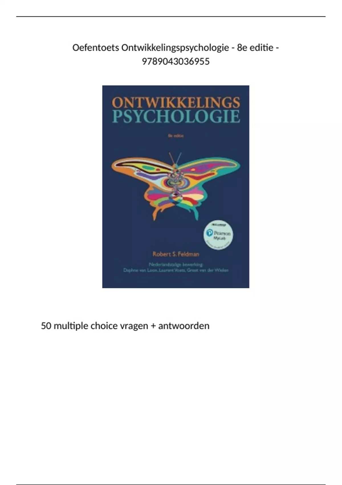 Oefentoets Ontwikkelingspsychologie - 8e editie - 9789043036955. Toets bevat 50 multiple choice vragen afkomstig uit het gehele boek. Deze toets helpt je kennis te meten en met een goed gevoel het tentamen in te gaan. Inclusief juiste antwoorden. Succes!