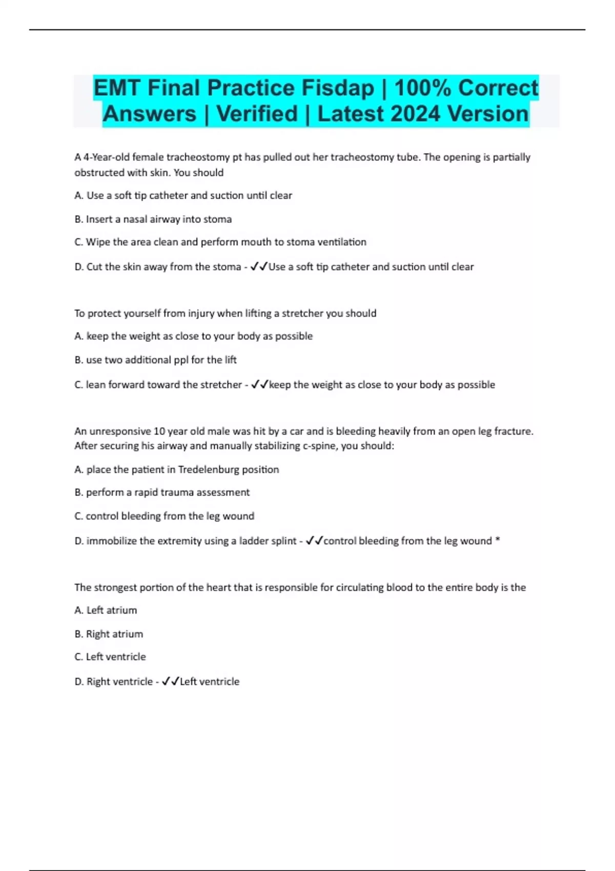 A 4-Year-old female tracheostomy pt has pulled out her tracheostomy tube. The opening is partially obstructed with skin. You should A. Use a soft tip catheter and suction until clear B. Insert a nasal airway into stoma C. Wipe the area clean and perform mouth to stoma ventilation D. Cut the skin away from the stoma - Use a soft tip catheter and suction until clear To protect yourself from injury when lifting a stretcher you should A. keep the weight as close to your body as possible B. use two additional ppl for the lift C. lean forward toward the stretcher - keep the weight as close to your body as possible An unresponsive 10 year old male was hit by a car and is bleeding heavily from an open leg fracture. After securing his airway and manually stabilizing c-spine, you should: A. place the patient in Tredelenburg position B. perform a rapid trauma assessment C. control bleeding from the leg wound D. immobilize the extremity using a ladder splint - control bleeding from the leg wound * The strongest portion of the heart that is responsible for circulating blood to the entire body is the A. Left atrium B. Right atrium C. Left ventricle D. Right ventricle - Left ventricle