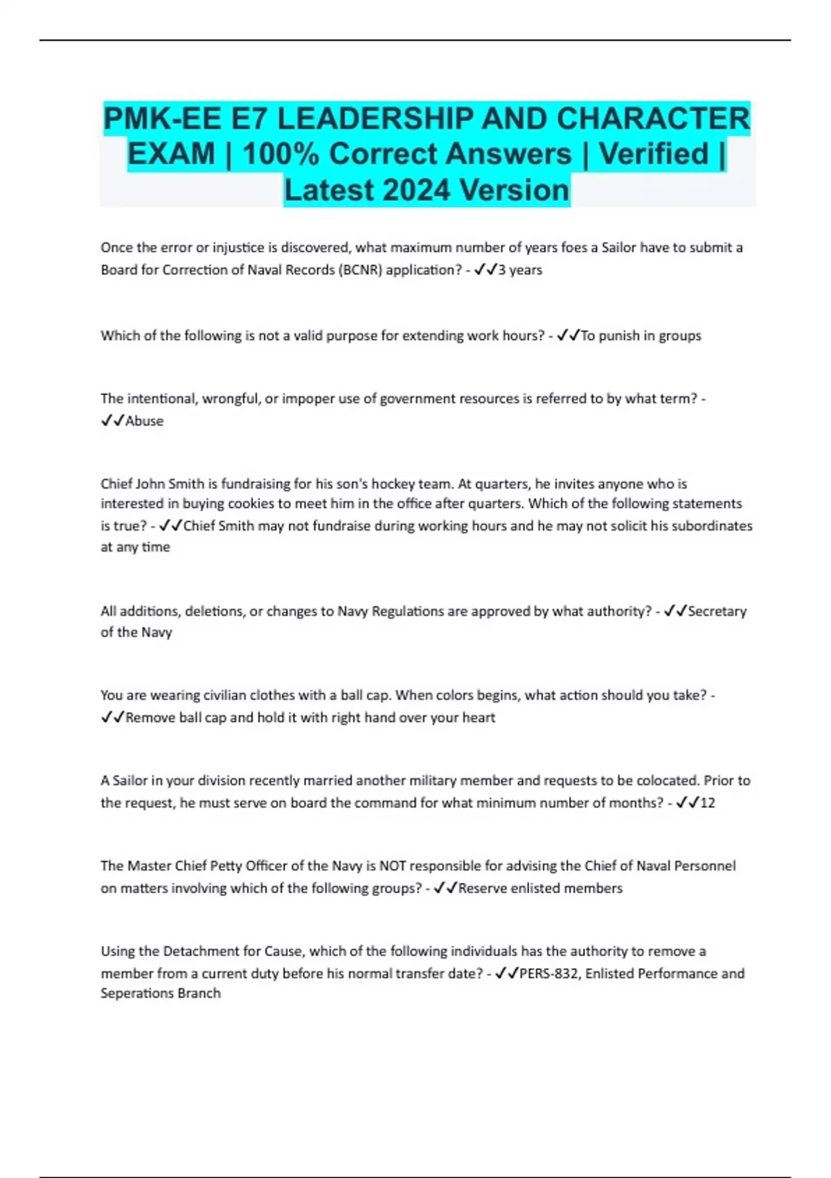 pmk ee e7 leadership and character exam 100 cor