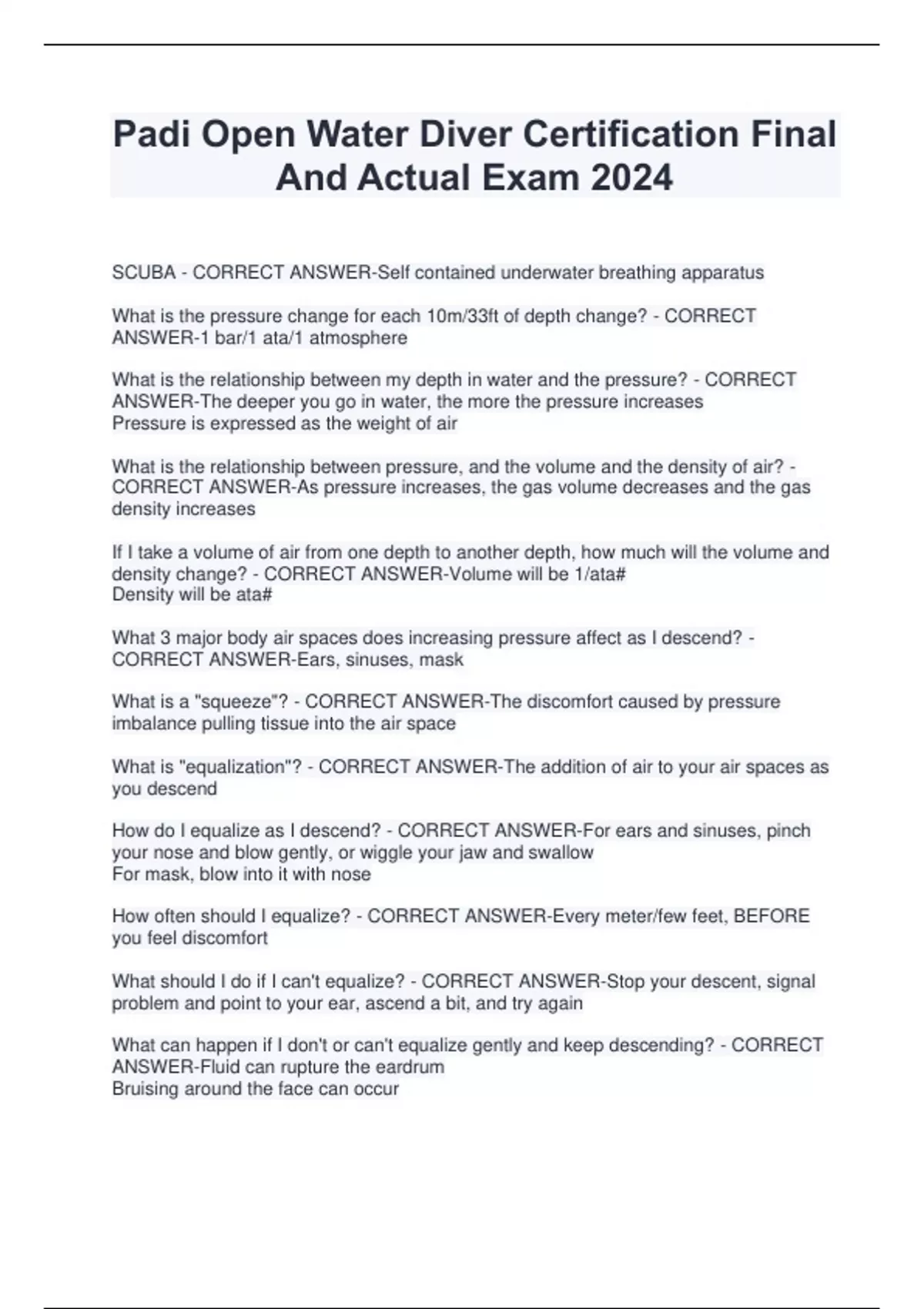 Padi Open Water Diver Certification Final And Actual Exam 2024 SCUBA - CORRECT ANSWER-Self contained underwater breathing apparatus What is the pressure change for each 10m/33ft of depth change? - CORRECT ANSWER-1 bar/1 ata/1 atmosphere What is the relationship between my depth in water and the pressure? - CORRECT ANSWER-The deeper you go in water, the more the pressure increases Pressure is expressed as the weight of air What is the relationship between pressure, and the volume and the density of air? - CORRECT ANSWER-As pressure increases, the gas volume decreases and the gas density increases If I take a volume of air from one depth to another depth, how much will the volume and density change? - CORRECT ANSWER-Volume will be 1/ata# Density will be ata# What 3 major body air spaces does increasing pressure affect as I descend? - CORRECT ANSWER-Ears, sinuses, mask What is a "squeeze"? - CORRECT ANSWER-The discomfort caused by pressure imbalance pulling tissue into the air space What is "equalization"? - CORRECT ANSWER-The addition of air to your air spaces as you descend How do I equalize as I descend? - CORRECT ANSWER-For ears and sinuses, pinch your nose and blow gently, or wiggle your jaw and swallow For mask, blow into it with nose How often should I equalize? - CORRECT ANSWER-Every meter/few feet, BEFORE you feel discomfort What should I do if I can't equalize? - CORRECT ANSWER-Stop your descent, signal problem and point to your ear, ascend a bit, and try again What can happen if I don't or can't equalize gently and keep descending? - CORRECT ANSWER-Fluid can rupture the eardrum Bruising around the face can occur Why does a congestion from a cold or allergy temporarily keep me from diving? - CORRECT ANSWER-Congestion might block normal air flow, making equalization difficult or impossible Why should I never dive with earplugs? - CORRECT ANSWER-They create air spaces that you can't equalize What other body air spaces are affected by increasing pressure? How do I equ