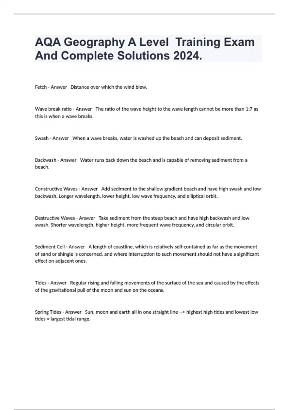 Fetch - Answer Distance over which the wind blew. Wave break ratio - Answer The ratio of the wave height to the wave length cannot be more than 1:7 as this is when a wave breaks. Swash - Answer When a wave breaks, water is washed up the beach and can deposit sediment. Backwash - Answer Water runs back down the beach and is capable of removing sediment from a beach. Constructive Waves - Answer Add sediment to the shallow gradient beach and have high swash and low backwash. Longer wavelength, lower height, low wave frequency, and elliptical orbit. Destructive Waves - Answer Take sediment from the steep beach and have high backwash and low swash. Shorter wavelength, higher height, more frequent wave frequency, and circular orbit. Sediment Cell - Answer A length of coastline, which is relatively self-contained as far as the movement of sand or shingle is concerned, and where interruption to such movement should not have a significant effect on adjacent ones. Tides - Answer Regular rising and falling movements of the surface of the sea and caused by the effects of the gravitational pull of the moon and sun on the oceans. Spring Tides - Answer Sun, moon and earth all in one straight line -- highest high tides and lowest low tides = largest tidal range.