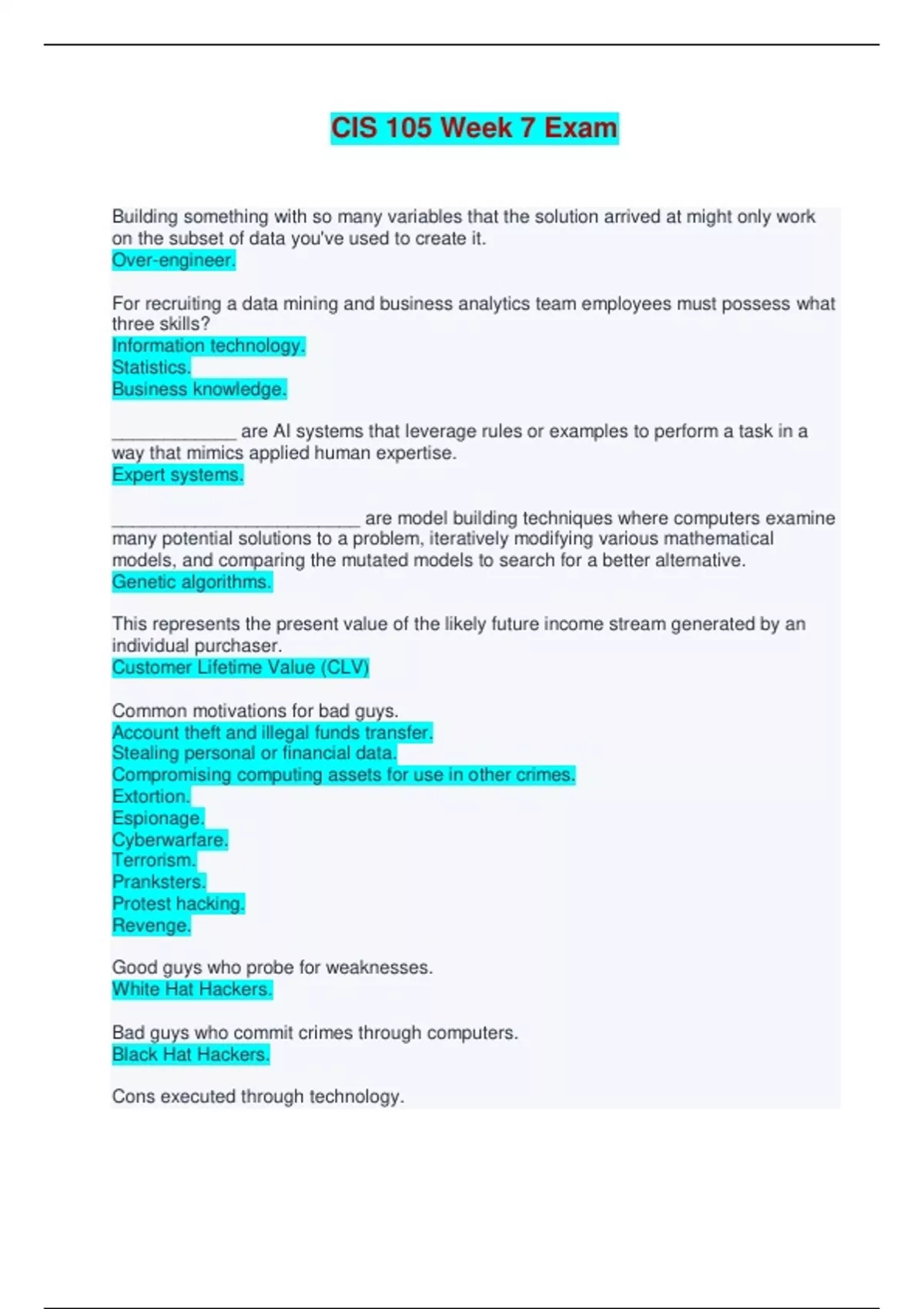 CIS 105 Week 7 Exam - Questions and Answers Building something with so many variables that the solution arrived at might only work on the subset of data you've used to create it. Over-engineer. For recruiting a data mining and business analytics team employees must possess what three skills? Information technology. Statistics. Business knowledge. ____________ are AI systems that leverage rules or examples to perform a task in a way that mimics applied human expertise. Expert systems. ________________________ are model building techniques where computers examine many potential solutions to a problem, iteratively modifying various mathematical models, and comparing the mutated models to search for a better alternative. Genetic algorithms. This represents the present value of the likely future income stream generated by an individual purchaser. Customer Lifetime Value (CLV) Common motivations for bad guys. Account theft and illegal funds transfer. Stealing personal or financial data. Compromising computing assets for use in other crimes. Extortion. Espionage. Cyberwarfare. Terrorism. Pranksters. Protest hacking. Revenge. Good guys who probe for weaknesses. White Hat Hackers. Bad guys who commit crimes through computers. Black Hat Hackers. Cons executed through technology. Phishing. This seeks to compromise a computing system without permission. Malware. What are some key things to watch out for while building a model? Black Swan Events (events so extreme and unusual that they never showed up in the data used to build the model) Over-engineering the model (building it with so many variables that the solution arrived at might only work on the subset of data used to create it) Looking at a random but meaningless statistical fluke (because you did not set aside a portion of data to verify the results) Basing a decision or action purely on the results of a model, without taking the business context into account A _____ is either a single table or a collection of related tables. Database What factors enable a new age of data-driven, fact-based decision making? Increasingly standardized corporate data Access to rich, third-party data sets Cheap, fast computing Easier-to-use software True or False: Firms suffering a security breach can experience direct financial loss, exposed proprietary information, fines, legal payouts, court costs, damaged reputations, plummeting stock prices, and more. True True or False: Simply by knowing gender, birth date, and postal zip code, 87 percent of people in the US could be pinpointed by name. True Terms that depend on context hacker and hack _____ refers simply to raw facts and figures. Alone it tells you nothing. The real goal is to turn it into ______ by presenting it in a context where it can answer a question or support decision making. Data; information