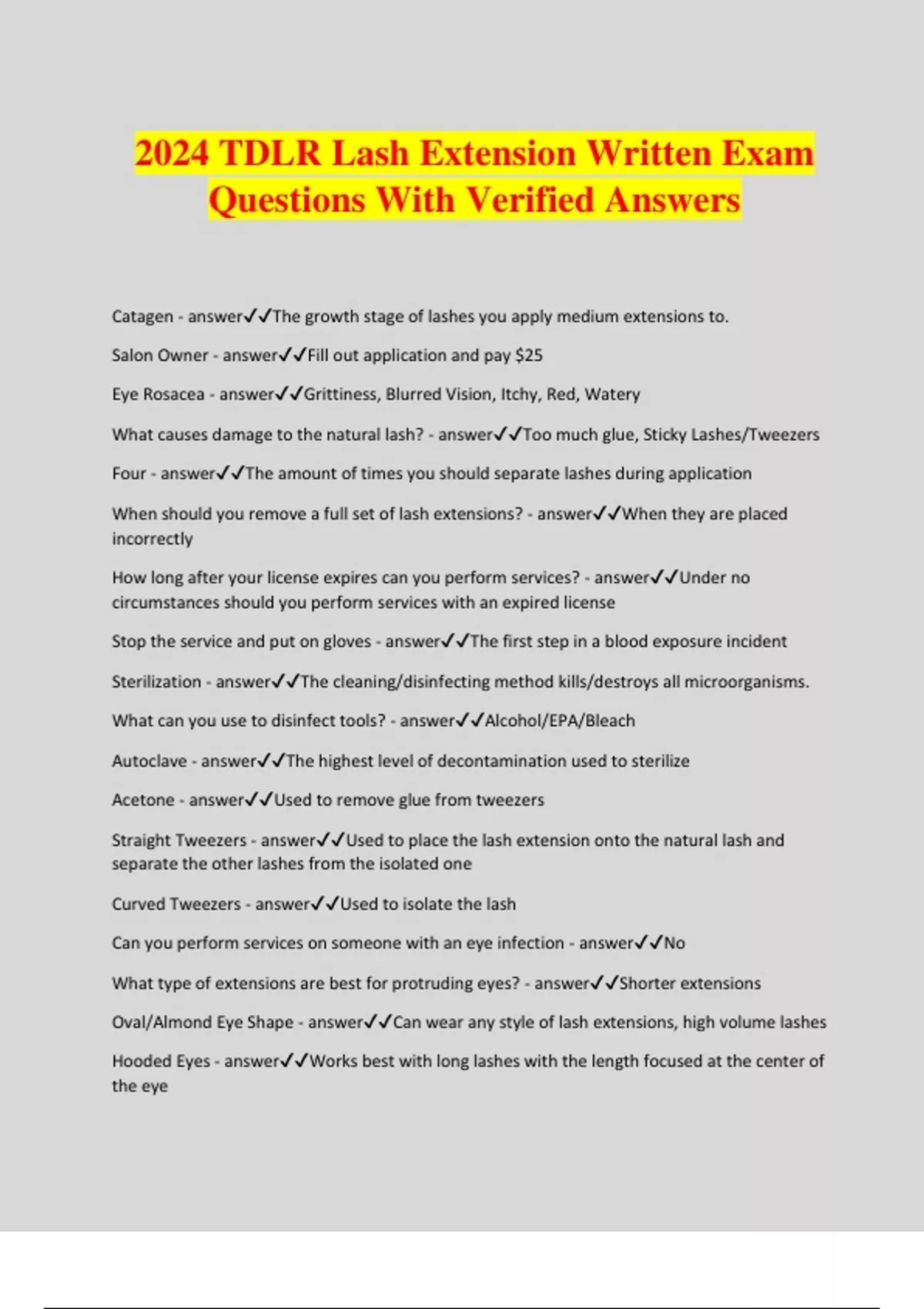 2024 TDLR Lash Extension Written Exam Questions With Verified Answers Catagen - answerThe growth stage of lashes you apply medium extensions to. Salon Owner - answerFill out application and pay $25 Eye Rosacea - answerGrittiness, Blurred Vision, Itchy, Red, Watery What causes damage to the natural lash? - answerToo much glue, Sticky Lashes/Tweezers Four - answerThe amount of times you should separate lashes during application When should you remove a full set of lash extensions? - answerWhen they are placed incorrectly How long after your license expires can you perform services? - answerUnder no circumstances should you perform services with an expired license Stop the service and put on gloves - answerThe first step in a blood exposure incident Sterilization - answerThe cleaning/disinfecting method kills/destroys all microorganisms. What can you use to disinfect tools? - answerAlcohol/EPA/Bleach Autoclave - answerThe highest level of decontamination used to sterilize Acetone - answerUsed to remove glue from tweezers Straight Tweezers - answerUsed to place the lash extension onto the natural lash and separate the other lashes from the isolated one Curved Tweezers - answerUsed to isolate the lash Can you perform services on someone with an eye infection - answerNo What type of extensions are best for protruding eyes? - answerShorter extensions Oval/Almond Eye Shape - answerCan wear any style of lash extensions, high volume lashes Hooded Eyes - answerWorks best with long lashes with the length focused at the center of the eye Round Eyes - answerLightweight less curly extensions work best Deep Set Eyes - answerWorks best with longer lashes that curl up at the ends 1 mm - answerThe distance from the lash line the extension should be placed What causes a corneal abrasion? - answerUnder eye sticker being placed to close to the lash line Discard/Throw away - answerWhat you do with unused extensions that you've removed from the package Unbroken Skin - answerThe first defense against bacteria Styptic Powder/Powdered Alum - answerUsed to stop minor bleeding Immersion - answerWhat comes after cleaning your impl