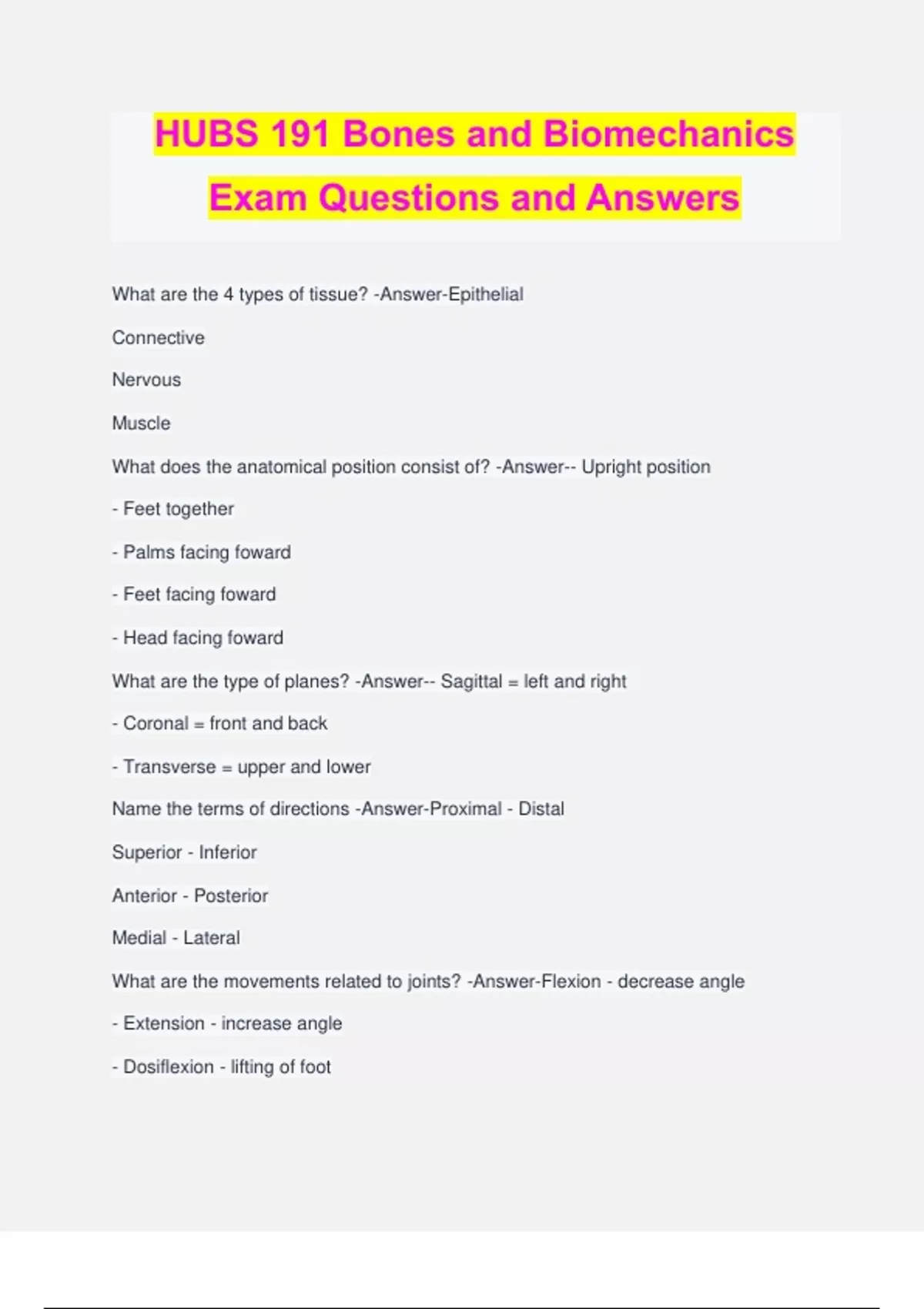 HUBS 191 Bones and Biomechanics Exam Questions and Answers What are the 4 types of tissue? -Answer-Epithelial Connective Nervous Muscle What does the anatomical position consist of? -Answer-- Upright position - Feet together - Palms facing foward - Feet facing foward - Head facing foward What are the type of planes? -Answer-- Sagittal = left and right - Coronal = front and back - Transverse = upper and lower Name the terms of directions -Answer-Proximal - Distal Superior - Inferior Anterior - Posterior Medial - Lateral What are the movements related to joints? -Answer-Flexion - decrease angle - Extension - increase angle - Dosiflexion - lifting of foot - Plantar flexion - pushing/planting of foot - Abduction - away from medial plane - Adduction - towards medial plane - Inversion - sole of foot towards midline - Eversion - sole of foot away from midline - Circumduction - all 4 motions, but rotation - Rotation - around the long axis of a joint What is circumduction? -Answer-Combination of Flexion, Extention, Adduction, and Abduction What is the function of epithelial tissue? -Answer-- Covers exposed surfaces - Lines internal passageways - Little ECM What is the function of connective tissue? -Answer-- Transports substances - Stores energy - Protecting organs