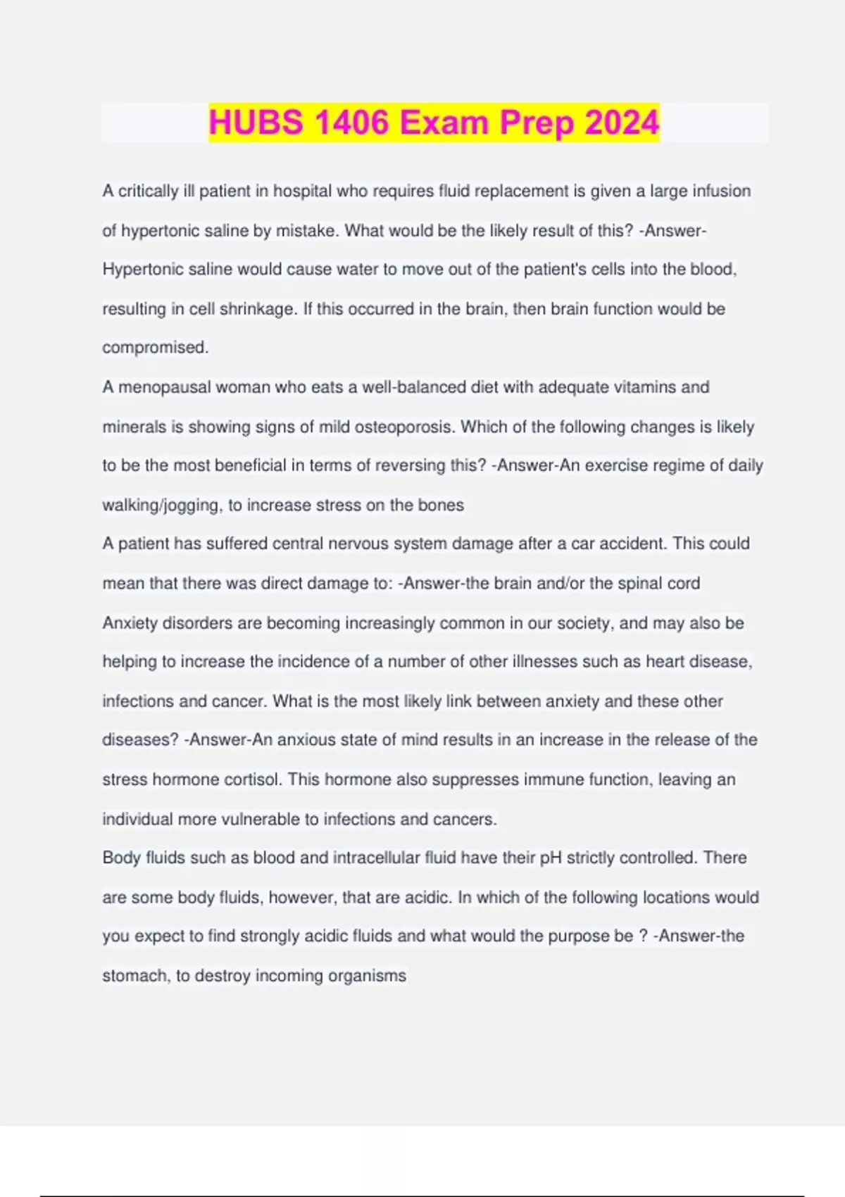 HUBS 1406 Exam Prep 2024 A critically ill patient in hospital who requires fluid replacement is given a large infusion of hypertonic saline by mistake. What would be the likely result of this? -Answer- Hypertonic saline would cause water to move out of the patient's cells into the blood, resulting in cell shrinkage. If this occurred in the brain, then brain function would be compromised. A menopausal woman who eats a well-balanced diet with adequate vitamins and minerals is showing signs of mild osteoporosis. Which of the following changes is likely to be the most beneficial in terms of reversing this? -Answer-An exercise regime of daily walking/jogging, to increase stress on the bones A patient has suffered central nervous system damage after a car accident. This could mean that there was direct damage to: -Answer-the brain and/or the spinal cord Anxiety disorders are becoming increasingly common in our society, and may also be helping to increase the incidence of a number of other illnesses such as heart disease, infections and cancer. What is the most likely link between anxiety and these other diseases? -Answer-An anxious state of mind results in an increase in the release of the stress hormone cortisol. This hormone also suppresses immune function, leaving an individual more vulnerable to infections and cancers. Body fluids such as blood and intracellular fluid have their pH strictly controlled. There are some body fluids, however, that are acidic. In which of the following locations would you expect to find strongly acidic fluids and what would the purpose be ? -Answer-the stomach, to destroy incoming organisms If a person does some very intense exercise, what is likely to happen to the acidity of their blood? -Answer-The pH will go down slightly, meaning the fluids are more acidic Patricia is suffering from emphysema which is limiting gas transfer in her lungs. Her arterial oxygen is low and her arterial carbon dioxide is high. However, the acidity of her arterial blood is still within normal limits. What is Patricia's body doing to keep the pH within normal limits? -Answer-Patricia's kidneys will be excreting more acid to compensate for the high arterial carbon dioxide level. People who suffer from asthma attacks are sometimes taught to breathe out through a small tube while they are having an attack. What good would this do? -Answer-The narrow tube would cause the air pressure inside the airways to increase, preventing the collapse of small airways during expiration. Premature babies may deveop great difficulty breathing immediately after birth, and have to make huge efforts to breathe - a condition known as infant respiratory distress syndrome. If this occurred, they would be given a particular drug via a breathing tube. What would this drug do? -Answer-It would reduce the surface tension in the alveoli of the lungs, allowing the babies to inflate their lungs more easily Soft bones (osteomalacia) and rickets can be a problem in people who keep their entire skin surface covered most of the time, for example, muslim women who wear a burka. Why would this be? -Answer-Bones rely on their calcium content to make them hard, and calcium absorption into the body is dependent on the active form of vitamin D. Vitamin D is converted to an active form by the action of sunlight on the skin. If the skin does not get any sunlight on it, then this process will not occur, and bones will become soft