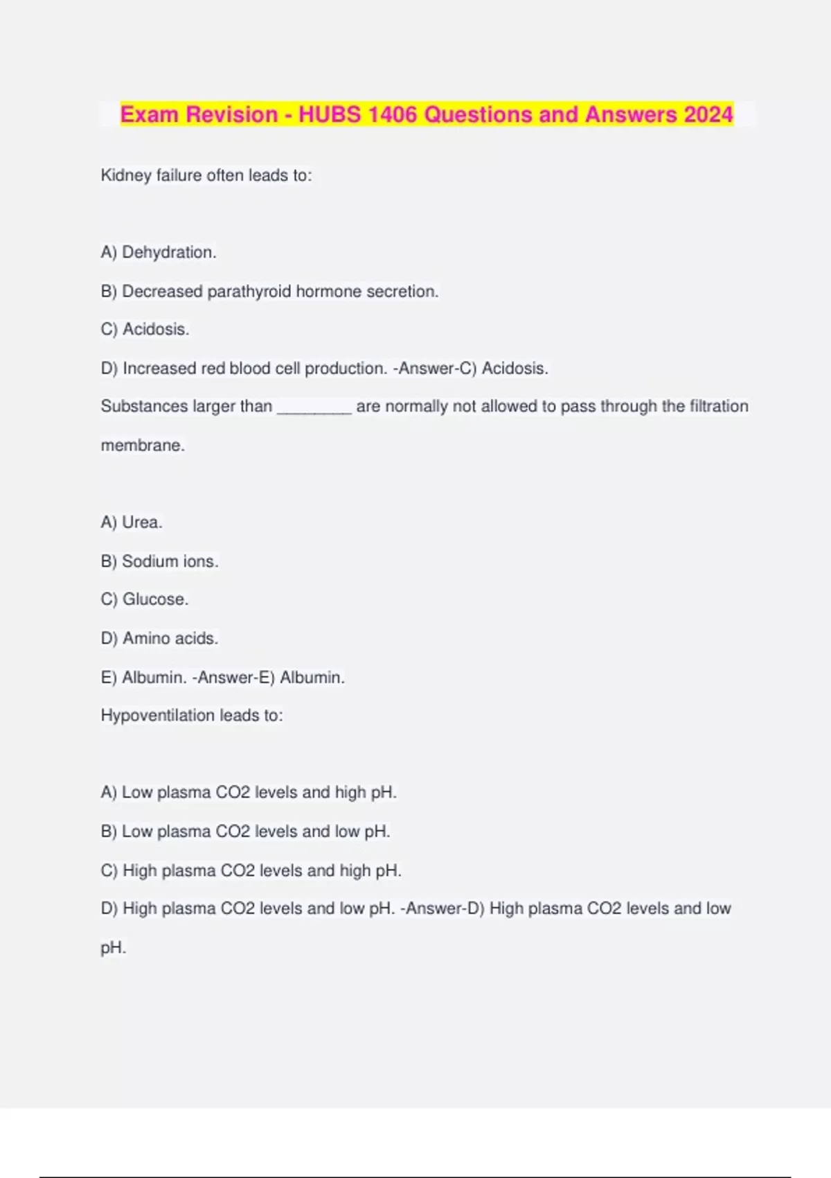 Exam Revision - HUBS 1406 Questions and Answers 2024 Kidney failure often leads to: A) Dehydration. B) Decreased parathyroid hormone secretion. C) Acidosis. D) Increased red blood cell production. -Answer-C) Acidosis. Substances larger than ________ are normally not allowed to pass through the filtration membrane. A) Urea. B) Sodium ions. C) Glucose. D) Amino acids. E) Albumin. -Answer-E) Albumin. Hypoventilation leads to: A) Low plasma CO2 levels and high pH. B) Low plasma CO2 levels and low pH. C) High plasma CO2 levels and high pH. D) High plasma CO2 levels and low pH. -Answer-D) High plasma CO2 levels and low pH. A person as lost a lot of blood after a large cut. Which of the following would be likely to occur as a result of the blood loss? A) Increased renin secretion. B) Increased parathyroid hormone secretion. C) Decreased aldosterone secretion. D) Decreased erythropoietin secretion. -Answer-A) Increased renin secretion. A person with chronic renal failure is likely to suffer from: A) Anaemia. B) Increased appetite. C) Quicker blood clotting. D) Alkalosis. -Answer-A) Anaemia. A person with chronic renal failure may have weak bones because: A) The effects of acidosis and parathyroid hormone would combine to decrease the minerals in bone. B) The effects of excess vitamin D would result in high plasma levels of calcium, leading to deposits in the bones. C) The nitrogenous wastes would build up in the bone. D) The effects of erythropoietin on the red bone marrow would weaken the bones. - Answer-A) The effects of acidosis and parathyroid hormone would combine to decrease the minerals in bone. A person with chronic obstructive pulmonary disease is unable to ventilate their lungs properly. Their kidneys are likely to respond to this by: A) Increasing excretion of bicarbonate ions. B) Increasing excretion of hydrogen ions. C) More retention of bicarbonate ions. D) B and C. -Answer-D) B and C. Quentin Van Hoogle was diagnosed as a child with a severe enterokinase deficiency. Based on what you know about this enzyme, which of the following effects would be the final result of this deficiency? A) Increased muscle growth and repair due to excess amino acid availability. B) Diarrhoea and abnormally high levels of nitrogenous wastes in urine. C) Constipation and development of obesity due to low leptin levels. D) Diarrhoea and oedema due to poor protein absorption. -Answer-D) Diarrhoea and oedema due to poor protein absorption. Linda the supermodel is permanently on a diet. She loves to eat her favourite diet mints, though, and gets through several packets a day. The sweetener in the mints is a sugar which is not absorbed. She finds that when she eats lots of mints she always gets diarrhoea. What is the most likely reason for this? A) The diarrhoea is most likely to be due to the fact that she has a poor diet and is malnourished