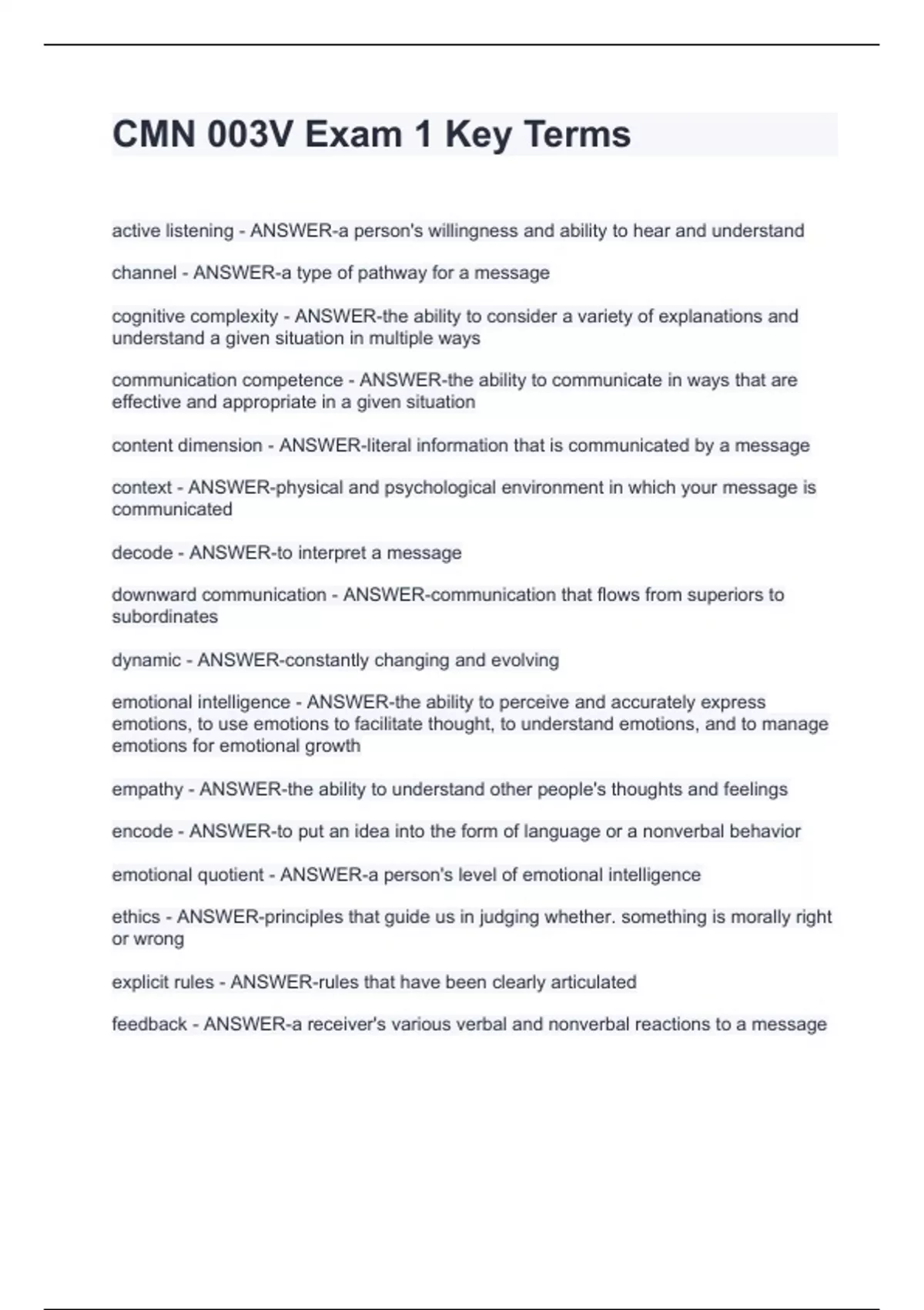 CMN 003V Exam 1 Key TermsCMN 003V Exam 1 Key TermsCMN 003V Exam 1 Key TermsCMN 003V Exam 1 Key Terms active listening - ANSWER-a person's willingness and ability to hear and understand channel - ANSWER-a type of pathway for a message cognitive complexity - ANSWER-the ability to consider a variety of explanations and understand a given situation in multiple ways communication competence - ANSWER-the ability to communicate in ways that are